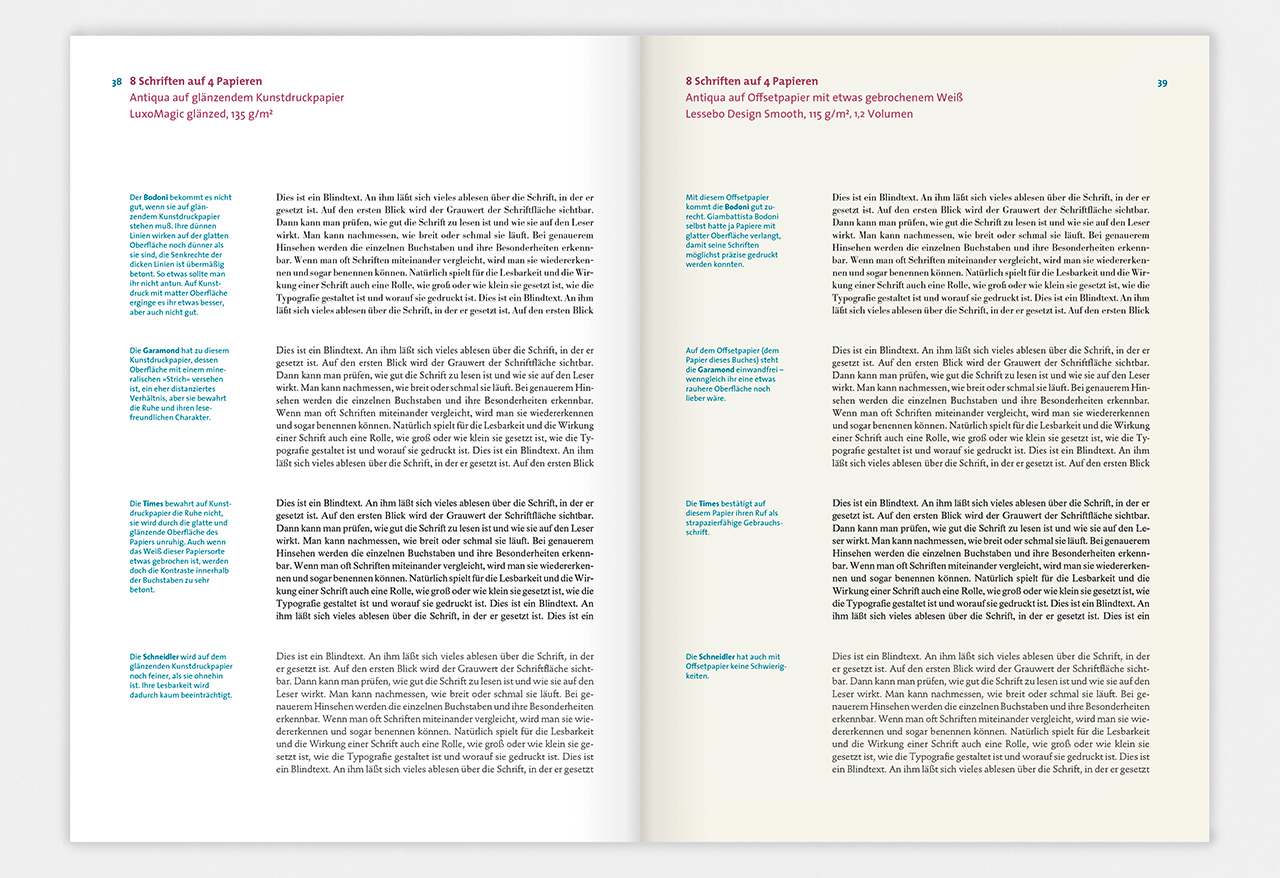 Dass die Papierwahl die Wirkung von Schrift beeinflusst, zeigen acht Schriften auf vier unterschiedlichen Papieren. Repro und Druck werden ebenso beleuchtet wie Block- und Flattersatz und typografische Betonungen. Die korrekte Behandlung von Ziffern und Zahlen sowie die beliebtesten Fehler runden den typografischen Parcours ab.