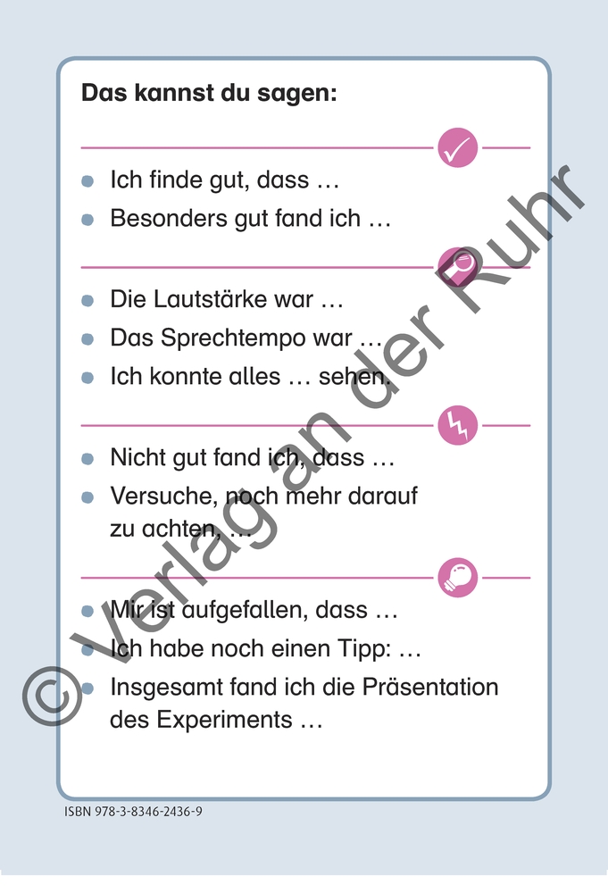 Organisationshilfe für Lehrer und Lehrerinnen an Grundschulen und Förderschulen, Soziales Lernen, Klasse 1-4 +++ Präsentieren will gelernt sein - genau wie das Geben einer konkreten und konstruktiven Rückmeldung. Aber worauf muss man als Zuschauer eigentlich achten? Und wie sieht ein wirklich hilfreiches Feedback aus? Mit diesen Karten lernen die Kinder, sich auf verschiedene Bereiche wie den reinen Inhalt, die Körpersprache oder die Darstellungsform zu konzentrieren. Auf den Vorderseiten erhalten sie dafür Anhaltspunkte zum Beobachten, auf der Rückseite finden sie passende Satzanfänge für eine präzise Rückmeldung. Alle Karten sind für zwei Niveaustufen und in mehrfacher Ausführung enthalten. So üben die Kinder beide Seiten der erfolgreichen Präsentation: das Präsentieren selbst sowie das Zuhören und Beobachten - damit sie hinterher mehr sagen können als nur "Also, ich fand es (nicht) gut."