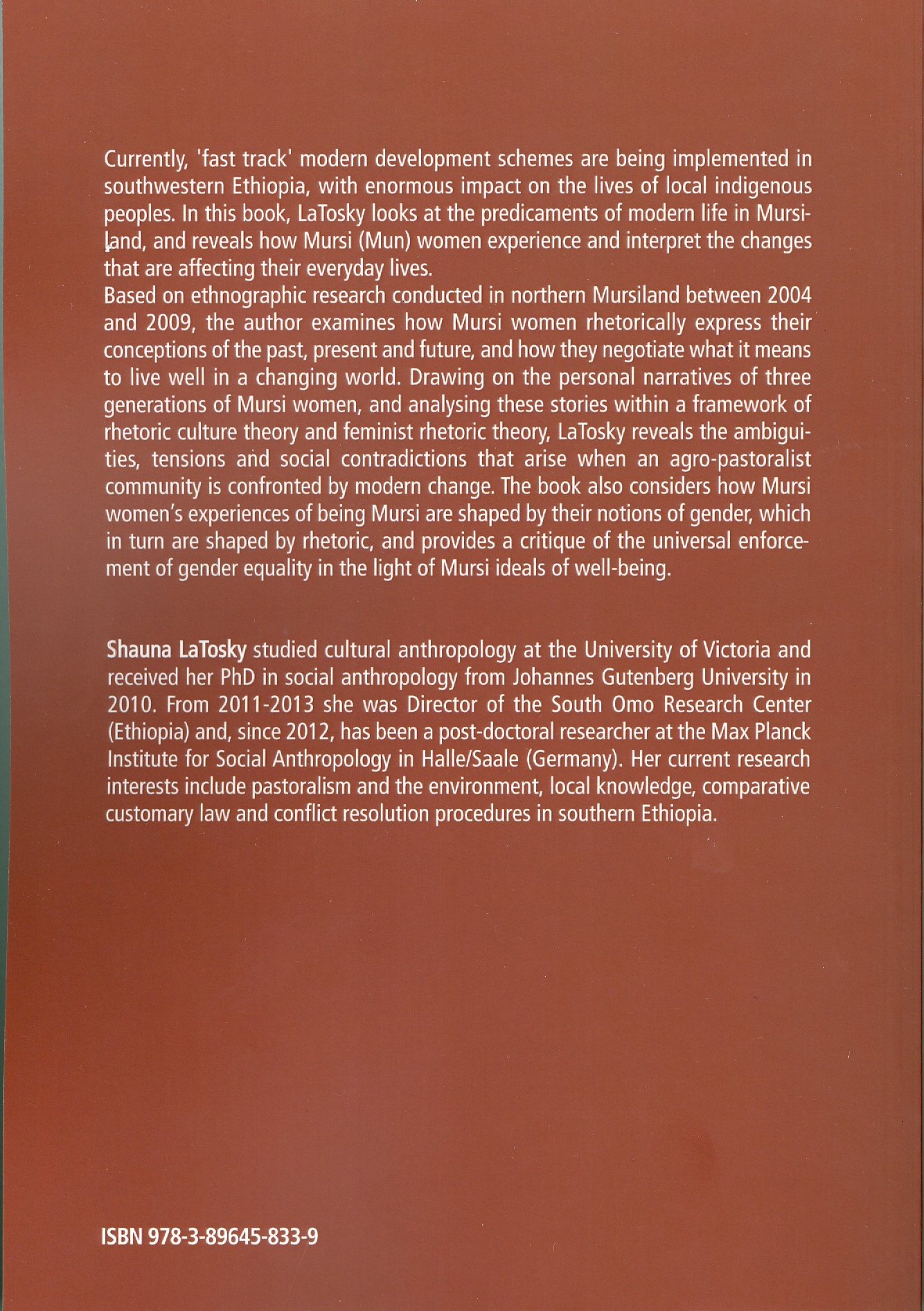 Die Gemeinschaft der Mursi (Mun) im südwestlichen Äthiopien erlebt heutzutage aufgrund des Ansturms moderner Entwicklungsmaßnahmen einen nie da gewesenen Wandel ihrer Lebensumstände. In der vorliegenden Studie zur schwierigen Situation modernen Lebens in dieser Region, gelingt es LaTosky, dem Leser die Art und Weise, wie Mursi-Frauen diese einschneidenden Veränderungen in ihrem Alltag erleben und interpretieren, näherzubringen.