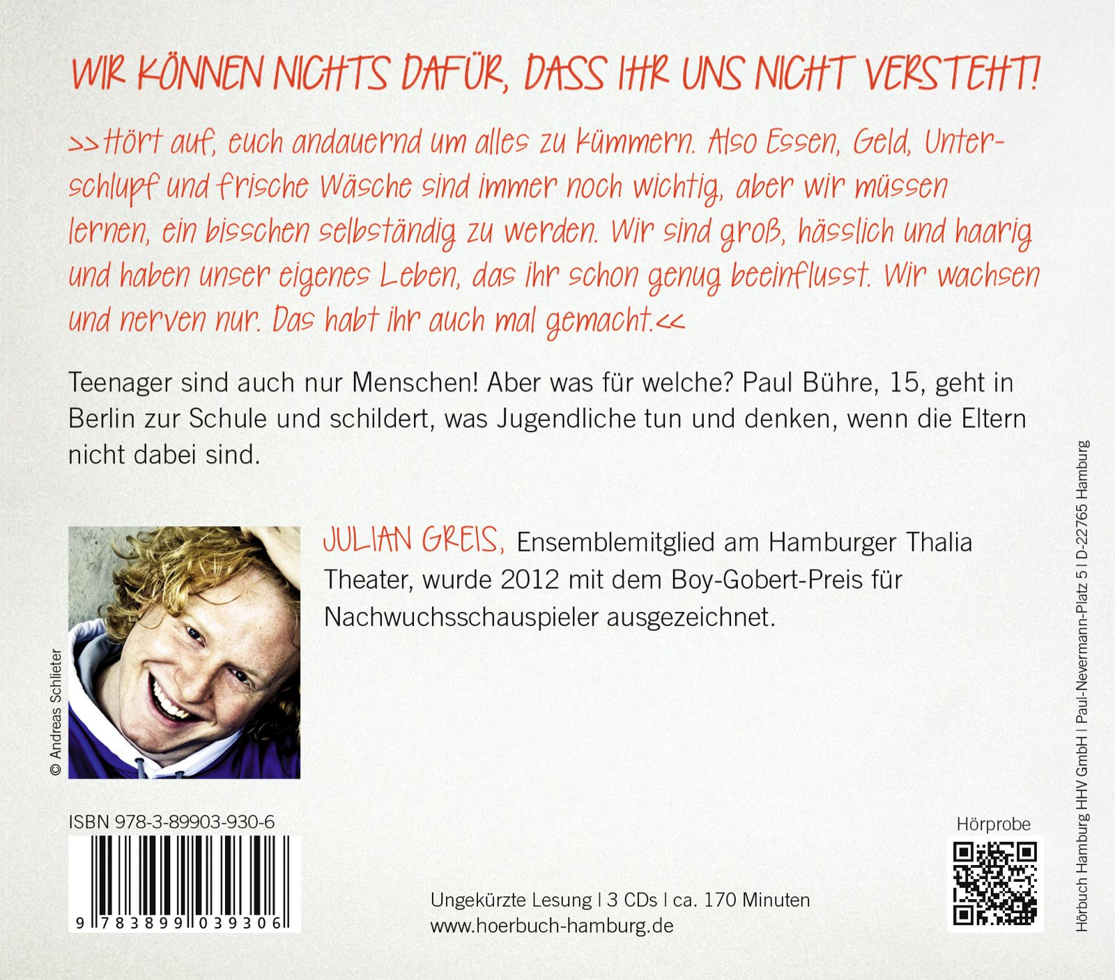 Julian Greis, 1983 geboren, spielte bereits während seiner Schauspielausbildung als Gast am Düsseldorfer Schauspielhaus und an der Württembergischen Landesbühne Esslingen. Nach seinem Engagement am Schauspielhaus Graz wechselte er 2009 an das Hamburger Thalia Theater. 2012 wurde er mit dem Boy-Gobert-Preis für Nachwuchsschauspieler ausgezeichnet. Neben dem Theater ist er als Film- und Fernsehschauspieler sowie als Sprecher für Hörspiele und Hörbücher tätig. 2017 erhielt er den Kinderhörbuchpreis BEO.