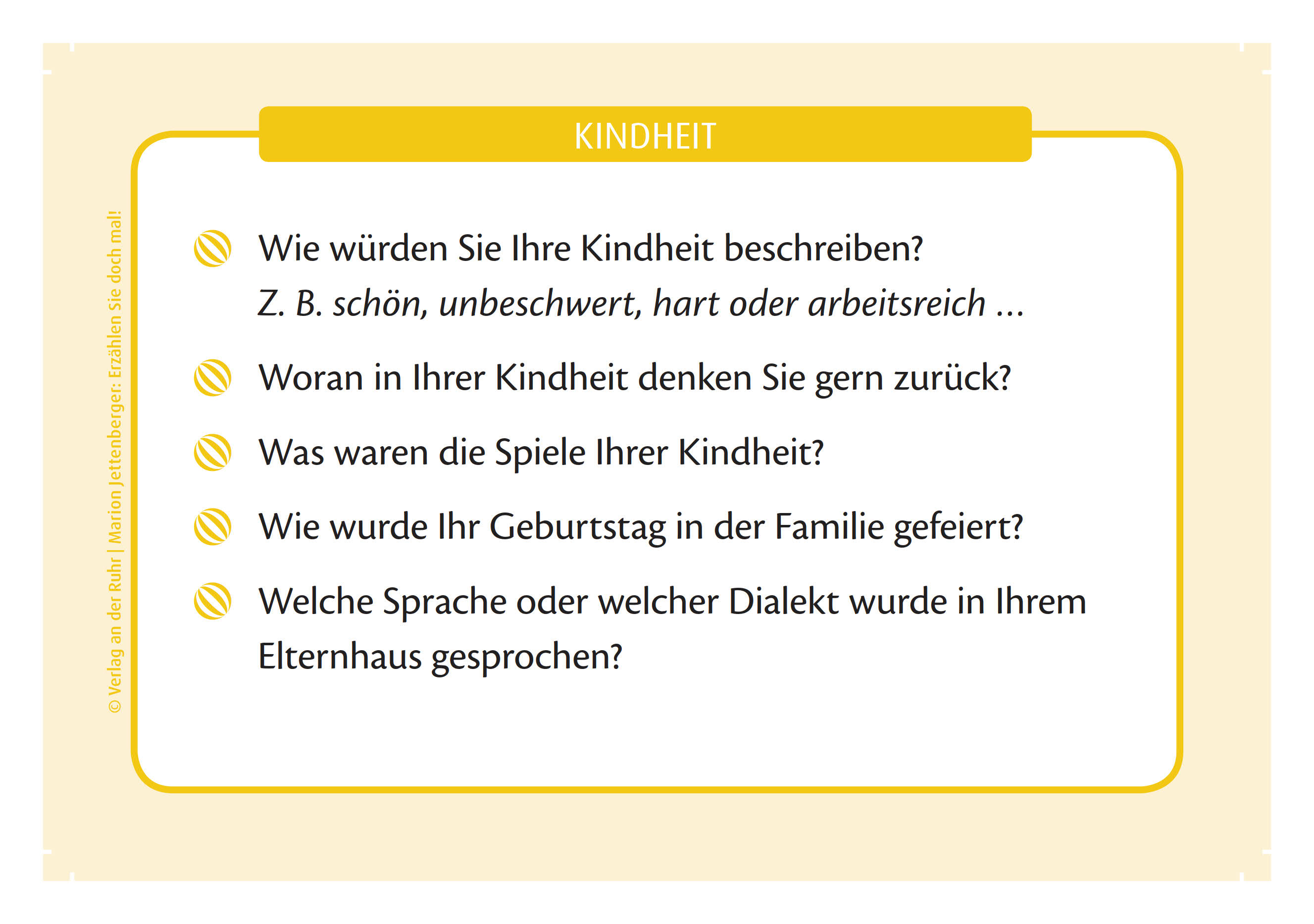 Kartenspiel-Set für die Biografiearbeit mit 120 Fragekarten zu 6 Themenbereichen, inkl. Farbwürfel und Begleitheft mit Spielanleitung +++ Begeben Sie sich gemeinsam mit Ihren Bewohnern oder Angehörigen auf eine Reise in deren Kindheit, Jugend und frühe Erwachsenenzeit und lassen Sie sie die Heilsamkeit des Rückblickens und Erzählens spüren. "Erzählen Sie doch mal!" ist ein Spiel, um ungezwungen mit den Senioren über deren Biografie und Lebensgeschichte ins Gespräch zu kommen, sich auszutauschen und die jeweils anderen daran teilhaben zu lassen. Gerade in der Pflege demenziell erkrankter Menschen, deren Identität stetig schwindet, je mehr die Demenz fortschreitet, kann das Wissen um die Lebensgeschichte hilfreich sein, um diese Menschen zu erreichen. Zu insgesamt sechs Themenbereichen - Kindheit, Erwachsen werden und sein, Schicksal, Lebensfreude, Herzensthemen, Lebensweg - gibt es je 20 Fragekarten, die mit einem Farbwürfel erwürfelt werden. Ohne große Vorbereitung können Sie so mit diesem Biografiespiel anregende Erzählrunden initiieren: Das Material ist so gestaltet, dass es sowohl in der Gruppe als auch im Einzelkontakt genutzt werden kann und dass die Themen ausweitbar sind, z.B. für geistig noch agile Betreute, jedoch ebenso reduzierbar - besonders für Menschen mit Demenz. Diese einfache, spielerische Methode lockert die Biografiearbeit auf und kann von Betreuern, Pflegefachkräften sowie Angehörigen genutzt werden. Ein Begleitheft mit Spielanleitung beschreibt, wie vielfältig das Biografiespiel eingesetzt werden kann und gibt wichtige Tipps für eine achtsame Gesprächsführung.
