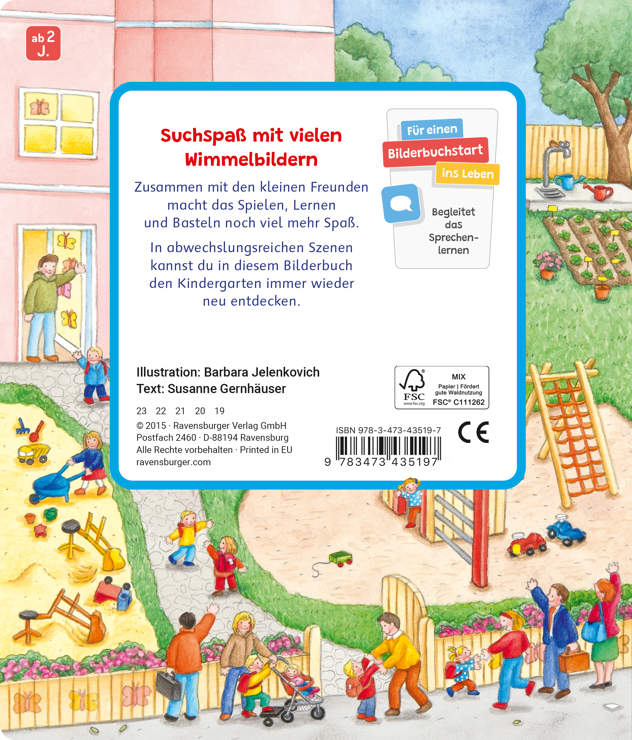 Schon in der Garderobe wird klar: In diesem Kindergarten kommen alle Kinder gerne an. Die kleinen Freunde werden begrüßt und helfen sich gegenseitig. Es geht weiter in die Gemeinschaftsräume zum Spielen, Basteln, Singen und Turnen. Natürlich gibt es auch eine Kuschel- und Vorleseecke. Und der Waschraum hat extra kleine Waschbecken und niedrige Kindertoiletten. Da macht das Händewaschen Spaß! Auf einer weiteren Seite wird Geburtstag gefeiert, zusammen musiziert und auch geturnt. Natürlich gehen die Kinder zusammen nach draußen: Im Garten kann getobt, gebuddelt und geklettert werden.Ein umfangreiches Themenbuch, ideal als Einstiegshilfe in den Kindergartenalltag.Einfache Texte mit kleinen Suchaufträgen regen dazu an, die Bildervignetten auf der rechten Seite im großen Bild zu suchen und wiederzuentdecken.