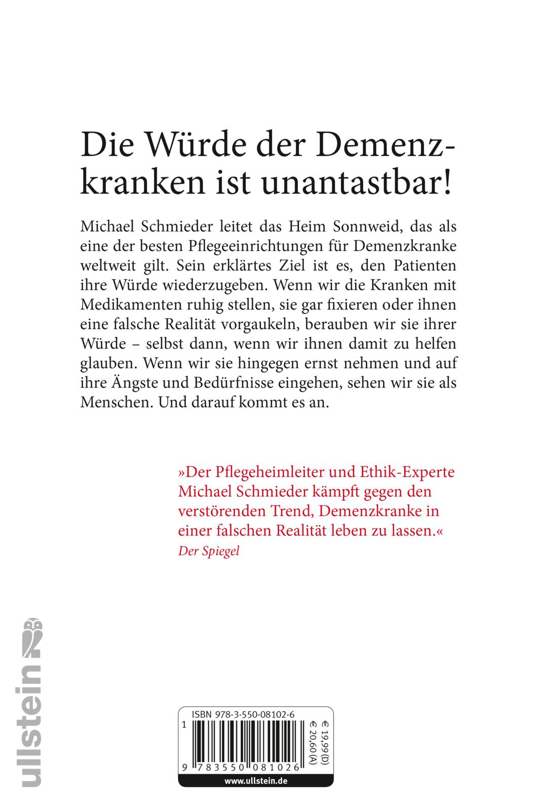 Worum geht es? Demenzkranke wollen als Menschen wahrgenommen werden. Aber wir "Gesunden" können nicht ertragen, einen geliebten Angehörigen ins Vergessen gleiten zu sehen - wir therapieren, beschäftigen und medikamentieren, damit wir uns nicht hilflos fühlen. Doch hilft das den Dementen? Nein, im Gegenteil. Die Kranken möchten in ihrem So-Sein angenommen werden. Dafür plädiert Michael Schmieder, und dieses Konzept praktiziert er im Pflegeheim Sonnweid - mit beeindruckendem Erfolg. Was ist besonders? Michael Schmieder ist ein Mann der Praxis: Er lebt das, was er schreibt. Er nimmt die Demenzkranken und ihre Bedürfnisse ernst und behandelt jeden Kranken als Individuum. Die Dementen bestimmen die Bedingungen, unter denen sie leben möchten. Wenn das bedeutet, dass eine Patientin nur noch Torte isst und ein anderer am besten im Flur schläft, so ist das in Ordnung. Hauptsache, es geht den Patienten gut. Und das tut es: Sonnweid gilt als eines der besten Pflegeheime für Demenzkranke. Wer liest? - Angehörige von Demenzkranken - alle, die mit Demenzkranken arbeiten - alle, die sich mit dem Thema beschäftigen