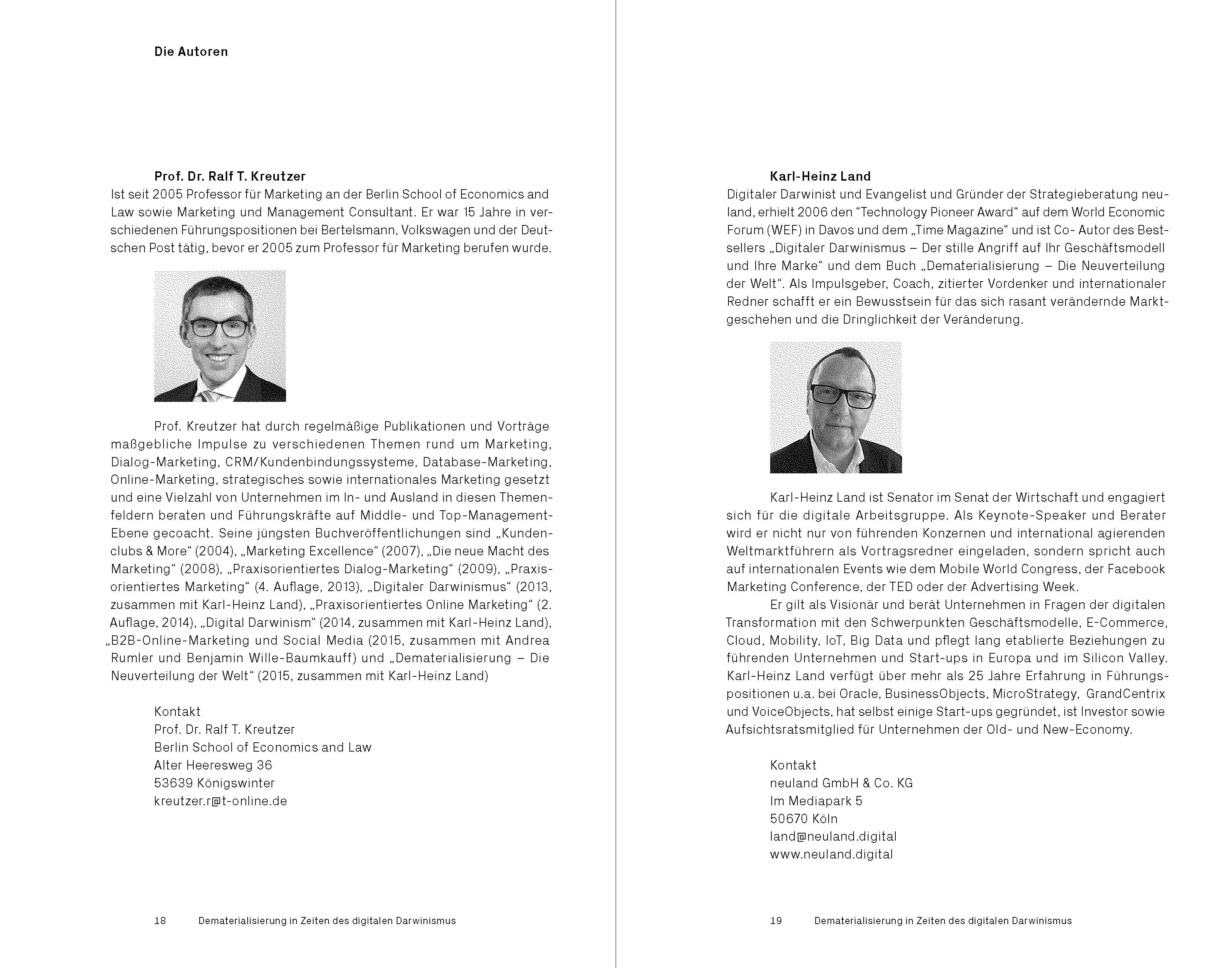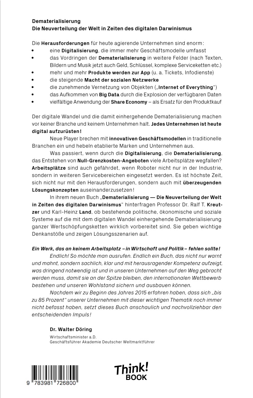 "Dematerialisierung - Die Neuverteilung der Welt in Zeiten des digitalen Darwinismus": In ihrem neuen Buch zeigen Bestseller-Autoren Karl-Heinz Land und Ralf T. Kreutzer, welche physischen Produkte künftig durch Digitallösungen ersetzt werden. Welchen Einfluss die Dematerialiseriung auf Wertschöpfungsketten, das Management von Unternehmen wie auch unser Konsumverhalten hat. Und wie sich unsere Arbeitswelt und die Struktur unserer Gesellschaft durch die kreative Kraft der Dematerialisierung verändern.