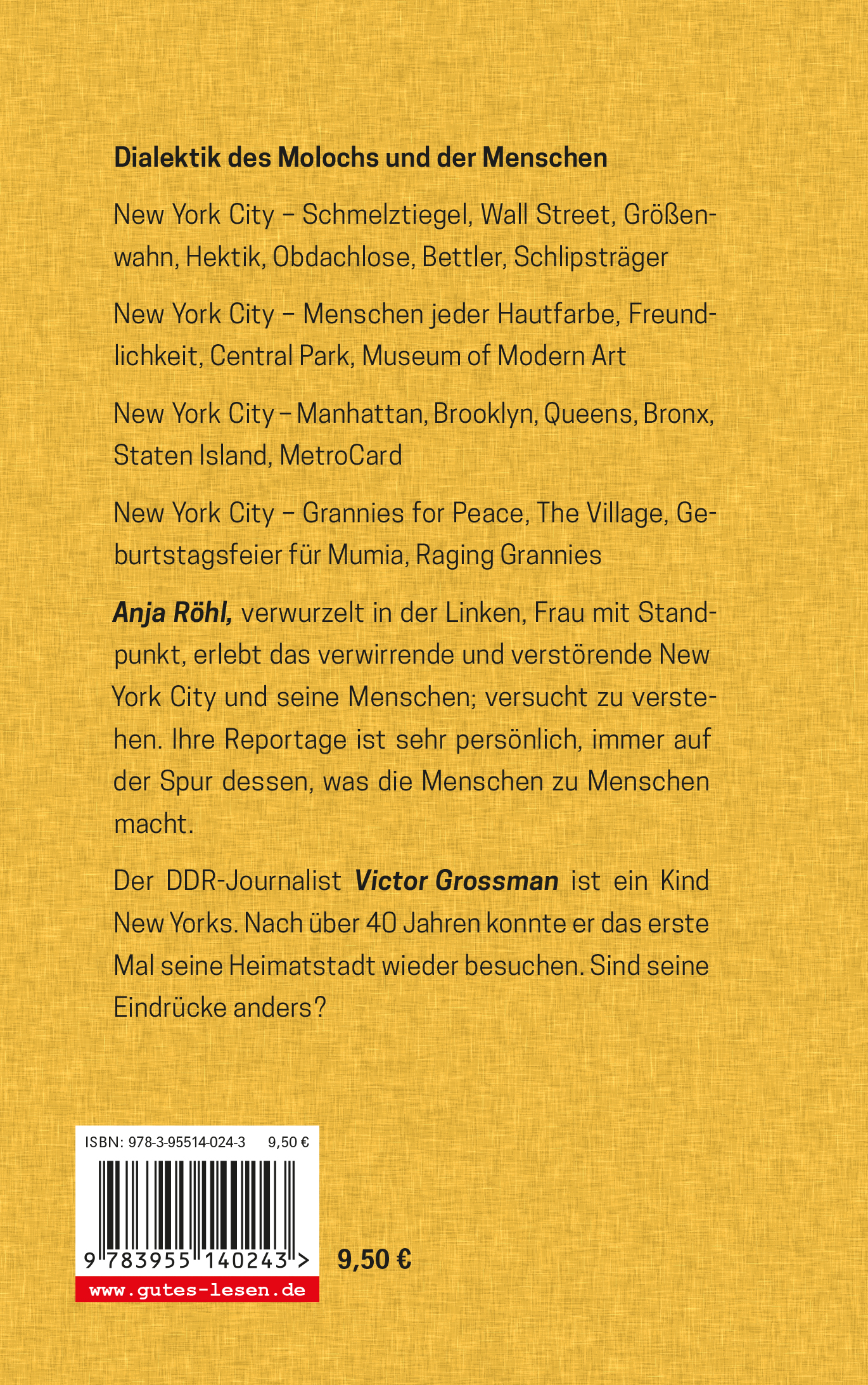 Anja Röhl, verwurzelt in der Linken, Frau mit Stand- punkt, erlebt das verwirrende und verstörende New York City und seine Menschen; versucht zu verste- hen. Ihre Reportage ist sehr persönlich, immer auf der Spur dessen, was die Menschen zu Menschen