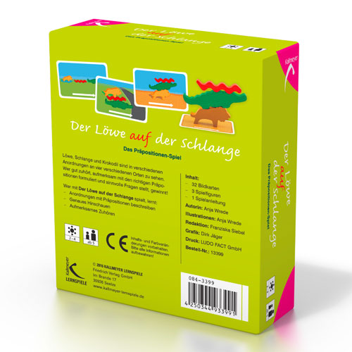 Löwe, Schlange und Krokodil sind in verschiedenen Anordnungen an vier verschiedenen Orten zu sehen. Wer gut zuhört, aufmerksam mit den richtigen Präpositionen formuliert und sinnvolle Fragen stellt, gewinnt!Das Spiel kommt ohne schriftsprachliches Material aus und ist daher vielfältig einsetzbar - neben Deutsch auch in allen Fremdsprachen!Inhalt:32 Bildkarten, 3 Spielfiguren