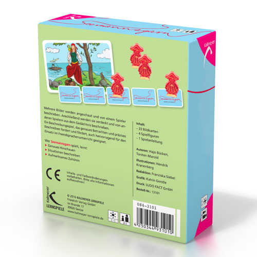 Mehrere Bilder werden angeschaut und von einem Spieler beschrieben. Anschließend werden sie verdeckt und von anderen Spielern aus dem Gedächtnis beschrieben.Ein Spiel, das genaues Betrachten und präzises Beschreiben fordert und fördert. Ohne schriftsprachliches Material, daher vielfältig einsetzbar - neben Deutsch auch in allen modernen Fremdsprachen!Inhalt:33 Bildkarten, 4 Spielfiguren