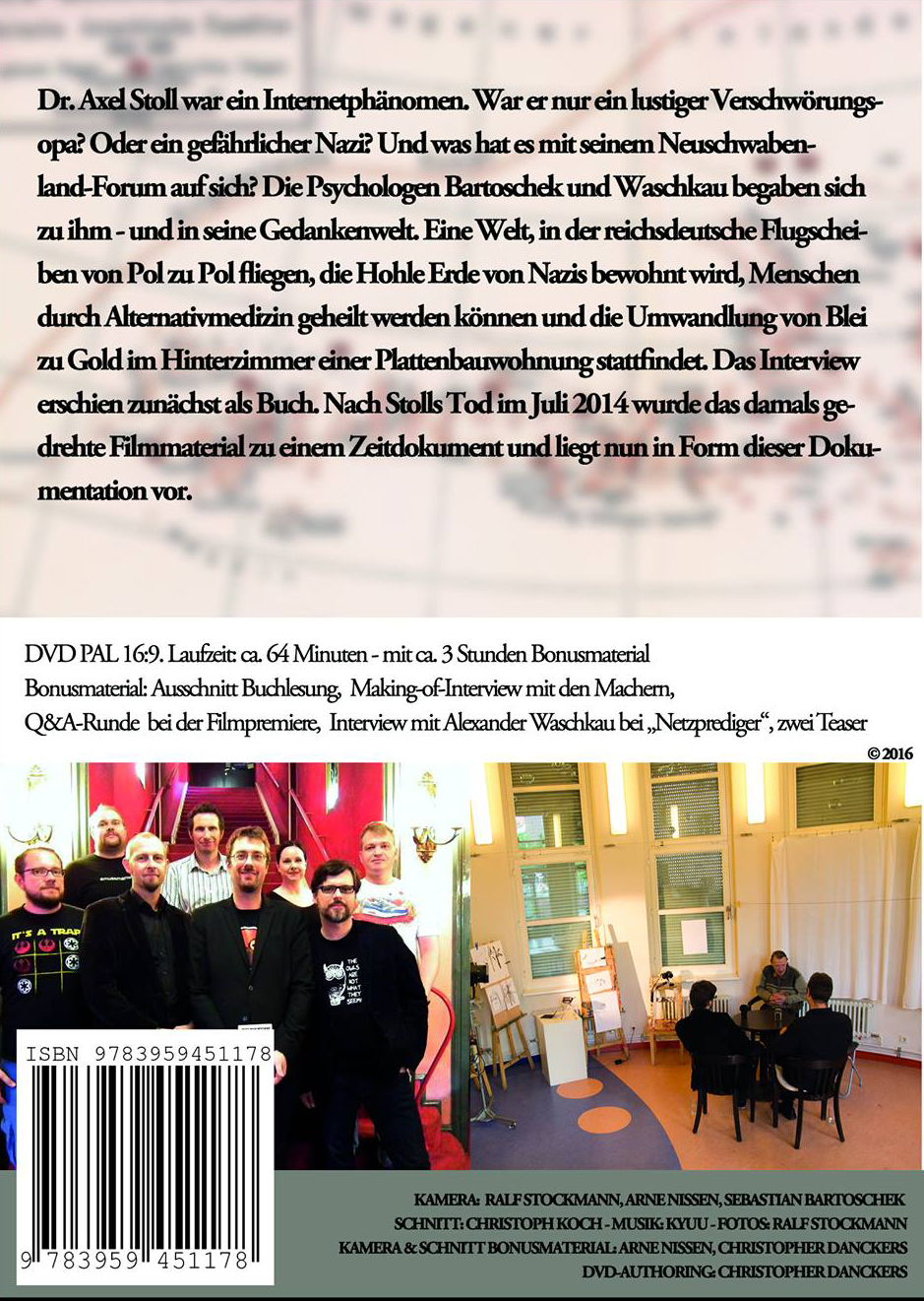 Die Idee für das Neuschwabenlandbuch entstand im Nachgang des Interviews mit dem am 28.07.2014 verstorbenen Dr. Axel Stoll im September 2013. Das gesamte Interview wurde damals gefilmt und dieses Rohmaterial schlummerte monatelang unberührt in unserem Archiv. Ende 2014 nahm sich dann ein Cutter des Materials an und erstellte einen ersten flüssigen Rohschnitt des Interviews.Nach Durchsicht dieser Fassung war es klar, dass auch in einem Film die Einordnung der Aussagen Dr. Stolls notwendig war. Dr. Sebastian Bartoschek, Alexa Waschkau und Alexander Waschkau machten sich also daran, geeignete Experten anzusprechen und für das Filmprojekt zu interessieren.Bald danach fuhren Sebastian und Alexander als Produzenten durch ganz Deutschland, um die O-Töne der Experten zu sammeln. Das Ergebnis ist ein gut 1-stündiges Zeitdokument der besonderen Art.