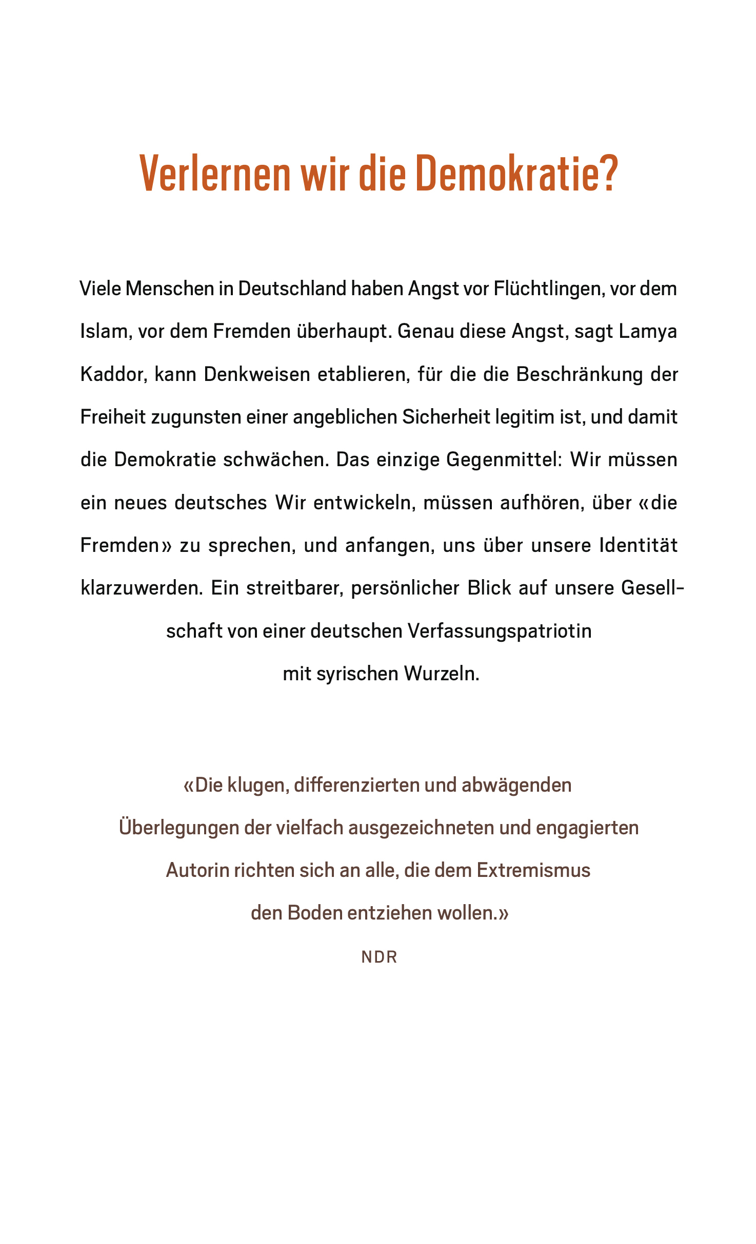 Alle reden davon, wie Flüchtlinge, Einwanderer sich integrieren können - Lamya Kaddor dreht die Frage um: Muss sich nicht auch die Mehrheitsgesellschaft ändern? Geht es nicht für alle darum, liberale Grundsätze zu leben? Mit Sorge beobachtet Kaddor, dass die Angst vor den Flüchtlingen, dem Islam, die Demokratie in Deutschland schwächt; dass sich Denkweisen etablieren, für die die Beschränkung der Freiheit zugunsten einer angeblichen Sicherheit legitim ist. Wer hinnimmt, dass Nordafrikanern der Zutritt zu Schwimmbädern verwehrt wird, läuft Gefahr, bald auch über die Beschränkung ganz anderer, fundamentaler Rechte sprechen zu müssen. Umgekehrt gilt, dass keine Ideologie, keine Weltanschauung über unserem Grundgesetz stehen darf: Auch hier droht der Demokratie in Deutschland Gefahr.
