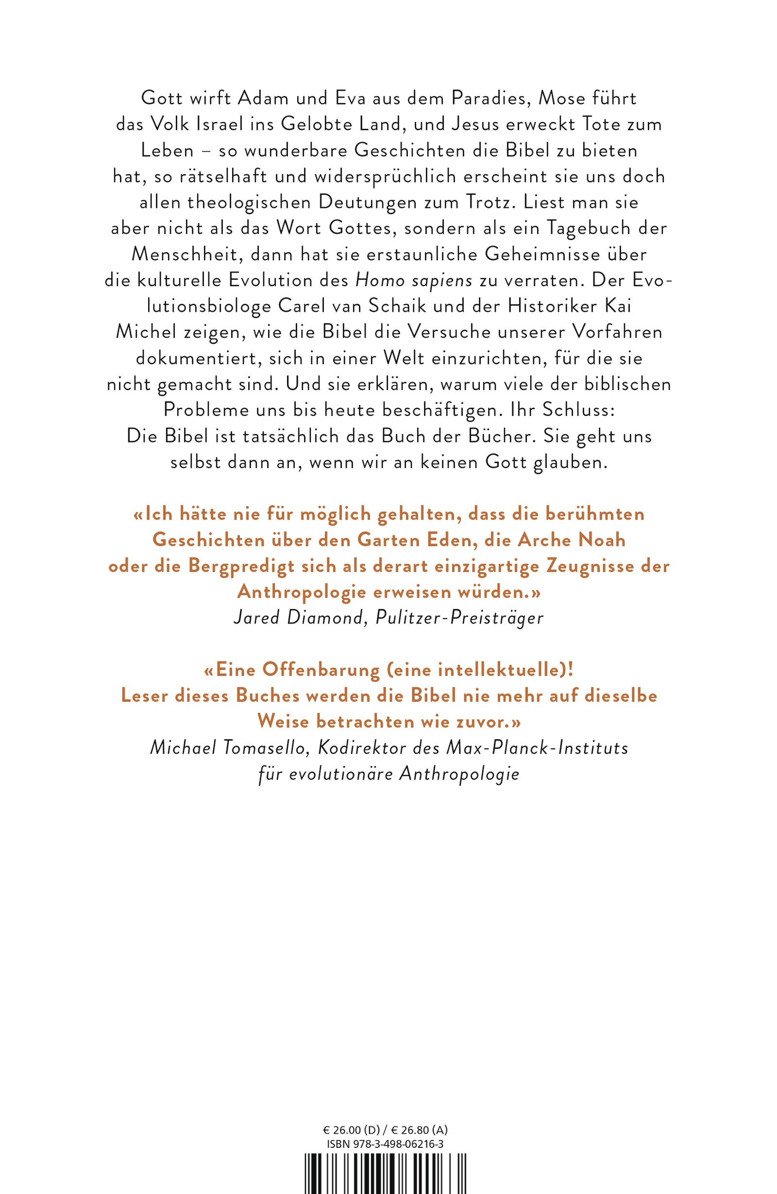 Die Autoren nehmen uns mit auf eine Reise voller Überraschungen, die von Eden über den Exodus aus Ägypten bis nach Golgatha und zur Apokalypse führt. Dabei eröffnet sich eine neue Perspektive auf die kulturelle Evolution des Menschen und der Religion. Wir begreifen, warum viele der biblischen Probleme uns bis zum heutigen Tage beschäftigen und warum nicht wenige von uns eine Sehnsucht nach dem Paradies verspüren. Die Bibel ist tatsächlich das Buch der Bücher. Sie geht uns selbst dann etwas an, wenn wir gar nicht an Gott glauben.