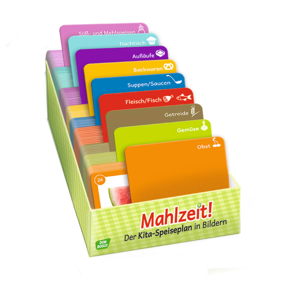 Bei gemeinsamen Mahlzeiten geht es nicht nur darum, den Hunger zu stillen! Auch der soziale Aspekt spielt eine große Rolle. Vom Tischgebet bis zu Unterhaltungen über Lieblingsspeisen: Für Kita-Kinder dreht sich im Laufe eines Tages erstaunlich viel um die nächste Mahlzeit. Bilder anstelle oder neben dazugehörigen Bezeichnungen auf dem Wochenspeiseplan erleichtern ihnen, selbstständig "abzulesen", was heute auf den Tisch kommt. Diese umfangreiche Lebensmittelkartei enthält über 200 Bildkarten: Essen kann so nicht nur dargestellt, sondern auch besprochen werden. Zusätzlich beinhaltet das Set Beispiele für Tischgebete und Tischsprüche. Kita-Kinder lieben Rituale - da darf das passende Sprüchlein vor der Mahlzeit nicht fehlen!