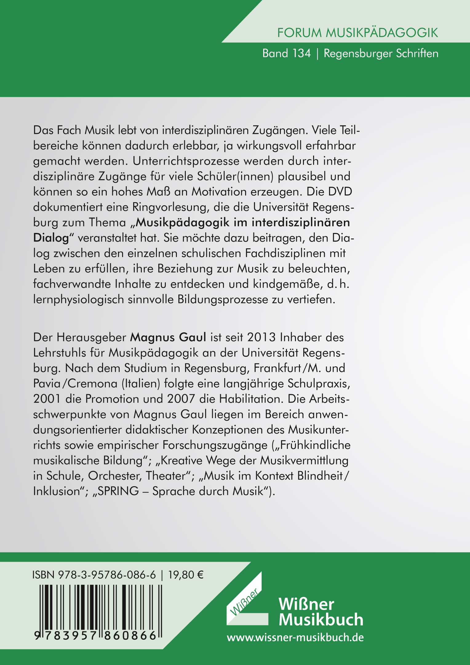 Das Fach Musik lebt von interdisziplinären Zugängen. Viele Teilbereiche können dadurch erlebbar, ja wirkungsvoll erfahrbar gemacht werden. Unterrichtsprozesse werden durch interdisziplinäre Zugänge für viele Schüler(innen) plausibel und können so ein hohes Maß an Motivation erzeugen. Die DVD dokumentiert eine Ringvorlesung, die die Universität Regensburg zum Thema "Musikpädagogik im interdisziplinären Dialog" veranstaltet hat. Sie möchte dazu beitragen, den Dialog zwischen den einzelnen schulischen Fachdisziplinen mit Leben zu erfüllen, ihre Beziehung zur Musik zu beleuchten, fachverwandte Inhalte zu entdecken und kindgemäße, d.h. lernphysiologisch sinnvolle Bildungsprozesse zu vertiefen.