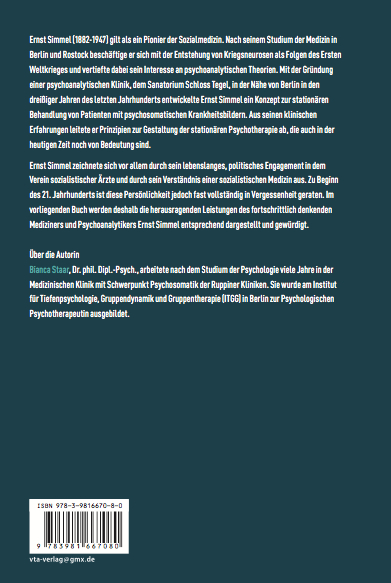 Ernst Simmel zeichnete sich vor allem durch sein lebenslanges, politisches Engagement in dem Verein sozialistischer Ärzte und durch sein Verständnis einer sozialistischen Medizin aus. Zu Beginn des 21. Jahrhunderts ist diese Persönlichkeit jedoch fast vollständig in Vergessenheit geraten. Im vorliegenden Buch werden deshalb die herausragenden Leistungen des fortschrittlich denkenden Mediziners und Psychoanalytikers Ernst Simmel entsprechend dargestellt und gewürdigt.