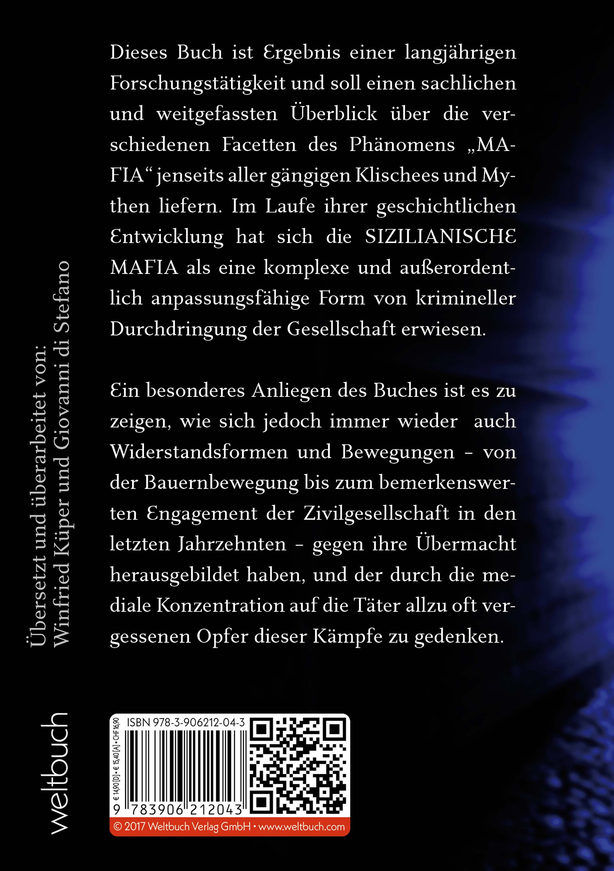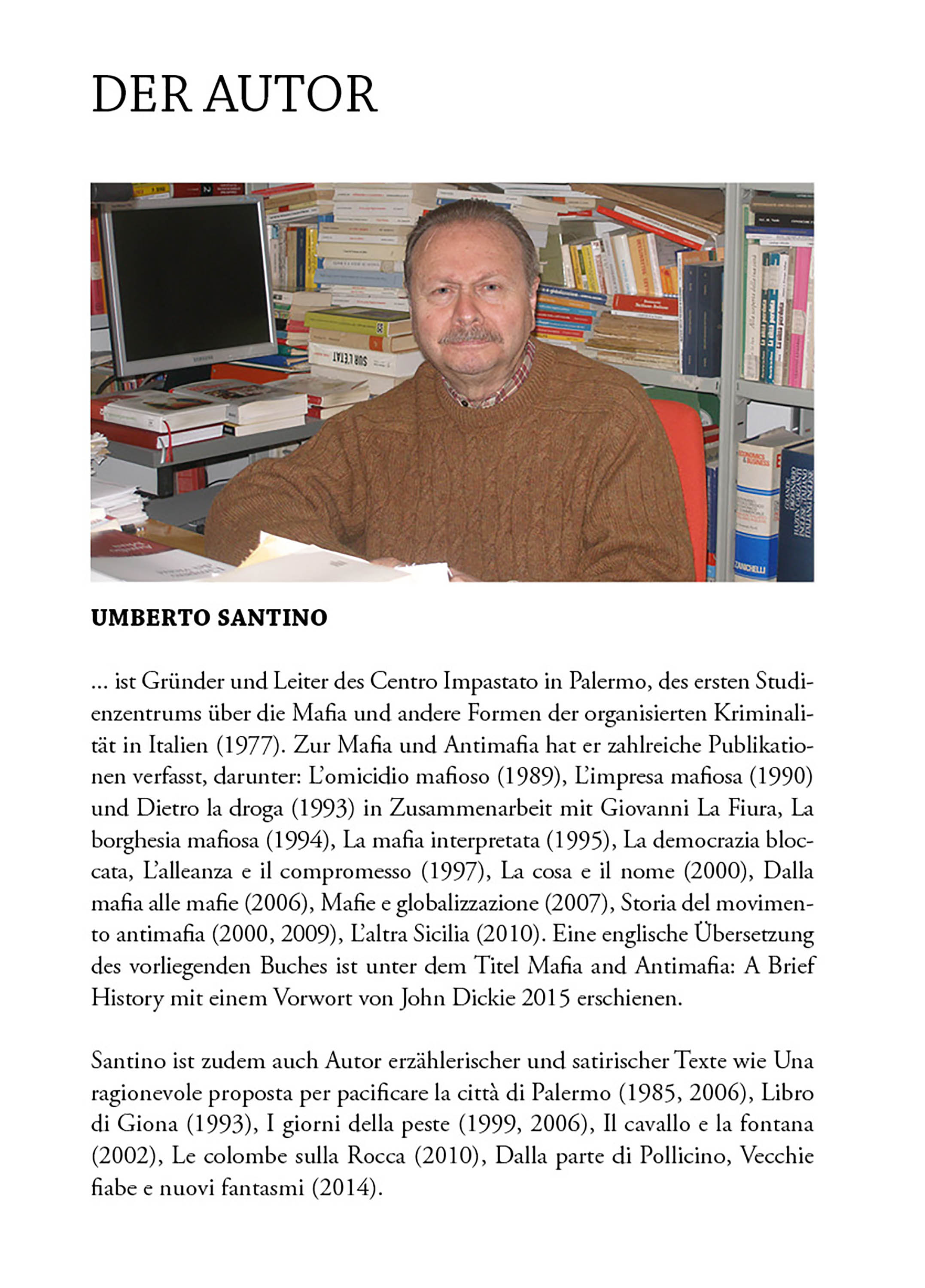 Umberto Santino ist Gründer und Leiter des Centro Impastato in Palermo, des ersten Studienzentrums über die Mafia und andere Formen der organisierten Kriminalität in Italien (1977). Zur Mafia und Antimafia hat er zahlreiche Publikationen verfasst, darunter: L’omicidio mafioso (1989), L’impresa mafiosa (1990) und Dietro la droga (1993) in Zusammenarbeit mit Giovanni La Fiura, La borghesia mafiosa (1994), La mafia interpretata (1995), La democrazia bloccata, L’alleanza e il compromesso (1997), La cosa e il nome (2000), Dalla mafia alle mafie (2006), Mafie e globalizzazione (2007), Storia del movimento antimafia (2000, 2009), L’altra Sicilia (2010). Eine englische Übersetzung des vorliegenden Buches ist unter dem Titel Mafia and Antimafia: A Brief History mit einem Vorwort von John Dickie 2015 erschienen. Santino ist zudem auch Autor erzählerischer und satirischer Texte wie Una ragionevole proposta per pacificare la città di Palermo (1985, 2006), Libro di Giona (1993), I giorni della peste (1999, 2006), Il cavallo e la fontana (2002), Le colombe sulla Rocca (2010), Dalla parte di Pollicino, Vecchie fiabe e nuovi fantasmi (2014).