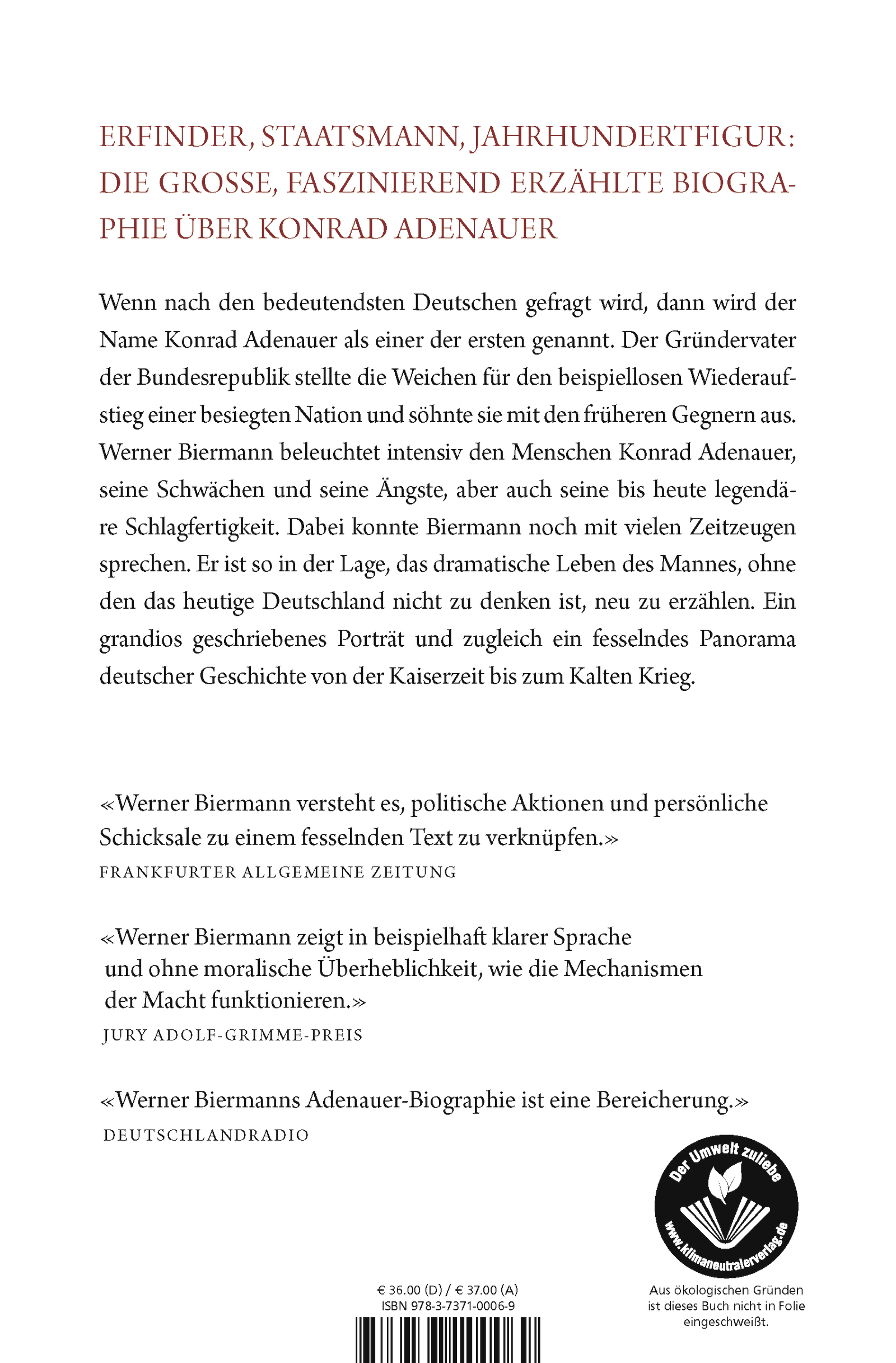 Werner Biermann erzählt dieses Jahrhundertleben, das von Bismarck bis zu den Beatles reichte. Auf der Grundlage bisher nicht beachteter Quellen, jahrelanger Recherchen sowie ausführlicher Gespräche mit der Familie schildert er den ebenso faszinierenden wie dramatischen Lebensweg Adenauers, seine Ideen und Ziele, seine Schwächen und Ängste. Besonderes Gewicht legt Biermann dabei auf das Leben vor der Kanzlerschaft: den politischen Aufstieg im Kaiserreich, die steile Karriere als Kölner Oberbürgermeister und prominenter Reichspolitiker in der Weimarer Republik und nicht zuletzt den jähen Absturz während des «Dritten Reiches» - der ihn beinahe das Leben gekostet hätte, als er 1944 verhaftet wurde. Dabei wird eines klar: Ohne sein in der Literatur bisher vernachlässigtes Vorleben ist der legendäre Kanzler nicht zu begreifen.