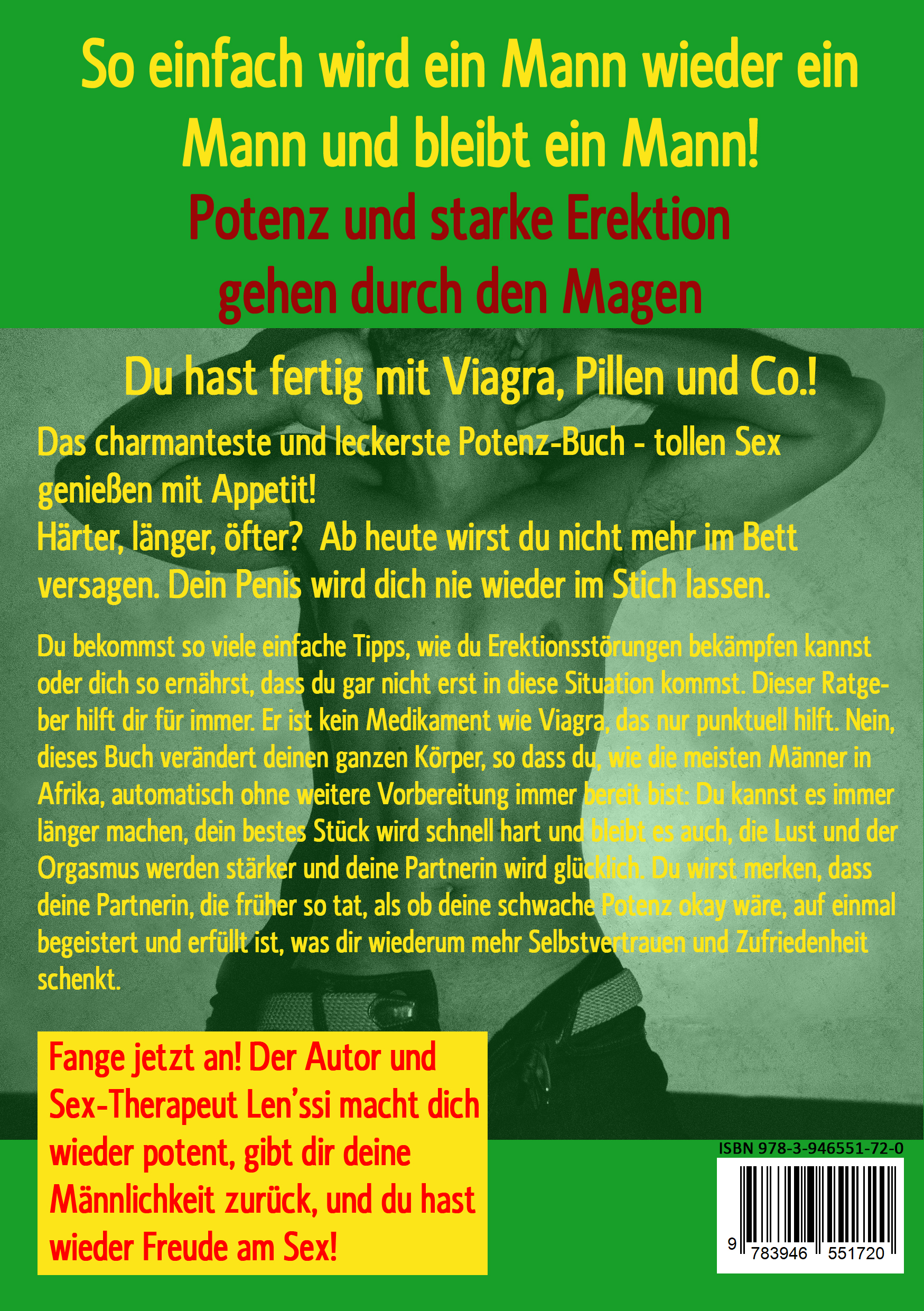 Wohl kaum etwas schlägt Männern so auf das Selbstbewusstsein wie Potenzprobleme. Dieses Buch verändert nicht nur radikal die Sexualität und die Erektion des Mannes, sondern macht ihn außerdem noch fit und gesund. Du wirst viele gesundheitliche Beschwerden loswerden und alles das OHNE NEBENWIRKUNGEN.Das Beste an diesem Ratgeber ist, dass du deine Potenz jederzeit umfangreich stärkst. Du brauchst nicht mehr unbedingt direkt vor dem Sexakt etwas einzunehmen. Dein Körper ist dann schon so programmiert, dass er sofort reagiert.In 90 Prozent der Fälle stecken keine psychischen Ursachen hinter Erektions- und Potenzschwäche, sondern eine falsche und schlechte Ernährung. Der Autor zeigt dir in diesem Buch, warum das so ist.Viele Tipps, Tricks und Methoden, die in diesem Buch empfohlen werden, werden nicht nur in Kamerun seit sehr langer Zeit erfolgreich zur Stärkung der Manneskraft eingesetzt. Bei den meisten Männern, die der Autor hier in Europa als Coach betreut hat, haben diese Tipps ihre Sexualität von Grund auf verändert.Du bekommst so viele einfache Tipps, wie du Erektionsstörungen bekämpfen kannst oder dich so ernährst, dass du gar nicht erst in diese Situation kommst. Dieser Ratgeber hilft dir für immer. Er ist kein Medikament wie Viagra, das nur punktuell hilft. Nein, dieses Buch verändert deinen ganzen Körper, so dass du, wie die meisten Männer in Afrika, automatisch ohne weitere Vorbereitung immer bereit bist: Du kannst es immer länger machen, dein bestes Stück wird schnell hart und bleibt es auch, die Lust und der Orgasmus werden stärker und deine Partnerin wird glücklich. Du wirst merken, dass deine Partnerin, die früher so tat, als ob deine schwache Potenz okay wäre, auf einmal begeistert und erfüllt ist, was dir wiederum mehr Selbstvertrauen und Zufriedenheit schenkt.Len'ssi erklärt dir genau, wie du deinen Darm, deine Leber und deinen Stoffwechsel fit machst, damit deine Testosteronproduktion auf Hochtouren läuft. Außerdem stellt er dir ausführlich viele leckere Lebensmittel vor, die die Testosteronbildung fördern, weil sie Bitterstoffe, Vitamine, Mineralstoffe, L-Arginin und L-Carnitin enthalten, basisch und ballaststoffreich sind und durch diese Eigenschaften echte Potenz-Booster sind. Eine ganz besondere Rolle spielen dabei Kräuter und Gewürze, vor allem Ingwer, Zwiebel, Knoblauch und scharfe Chili-Schoten, die dich heiß machen und für einen festen Stand deines Penis beim Liebesspiel sorgen! Außerdem lernst du viele leckere Tropenlebensmittel kennen, die zum Teil seit Jahrhunderten in Afrika als Potenzmittel eingesetzt werden. Manche wirst du kennen - wie z.B. Avocado, Ananas oder Bananen - andere werden neu für dich sein - wie z.B. Yohimbe, Maca oder Safou!Damit dir die Ernährung mit den Lust-boostenden Zutaten leicht fällt, findest du in diesem Buch auch zahlreiche aphrodisische, afrikanisch inspirierte Kochrezepte mit Fleisch und Fisch, die aber alle auch vegan zubereitet werden können: Gebratener Spinat mit Lachs und Nudeln zum Beispiel oder Djansang in Tomaten mit Hähnchen Maniok und ganz besonders die therapeutische, magische Sauce, die deinen Körper in Sexstimmung bringt: Makossa hot-rotic. Alle Rezepte schmecken hervorragend, und vor allem stärken sie deine Libido, deine Standhaftigkeit und deine Ausdauer beim Liebesspiel. Es hat einen Grund, warum afrikanische Männer als besonders potent gelten! Sex-Wundergetränke und Potenz-Booster-Smoothies runden deinen Speiseplan ab, der deine Sorgen um Potenz und Leistungsfähigkeit im Bett für immer verschwinden lässt. Dieses Buch ist aber mehr als ein Potenzratgeber. Es ist ein ganzheitliches Gesundheitsbuch. Die Erkenntnisse und das Wissen aus diesem Buch werden nicht nur die Potenz und die Lust radikal verbessern, sondern sie haben außerdem auf vielfältige Weise erstaunliche positive Nebenwirkungen: sie regen die Verdauung an, kurbeln die Fettverbrennung an und sind somit hilfreich bei der Gewichtsreduktion, helfen gegen Bluthochdruck und Herzkran