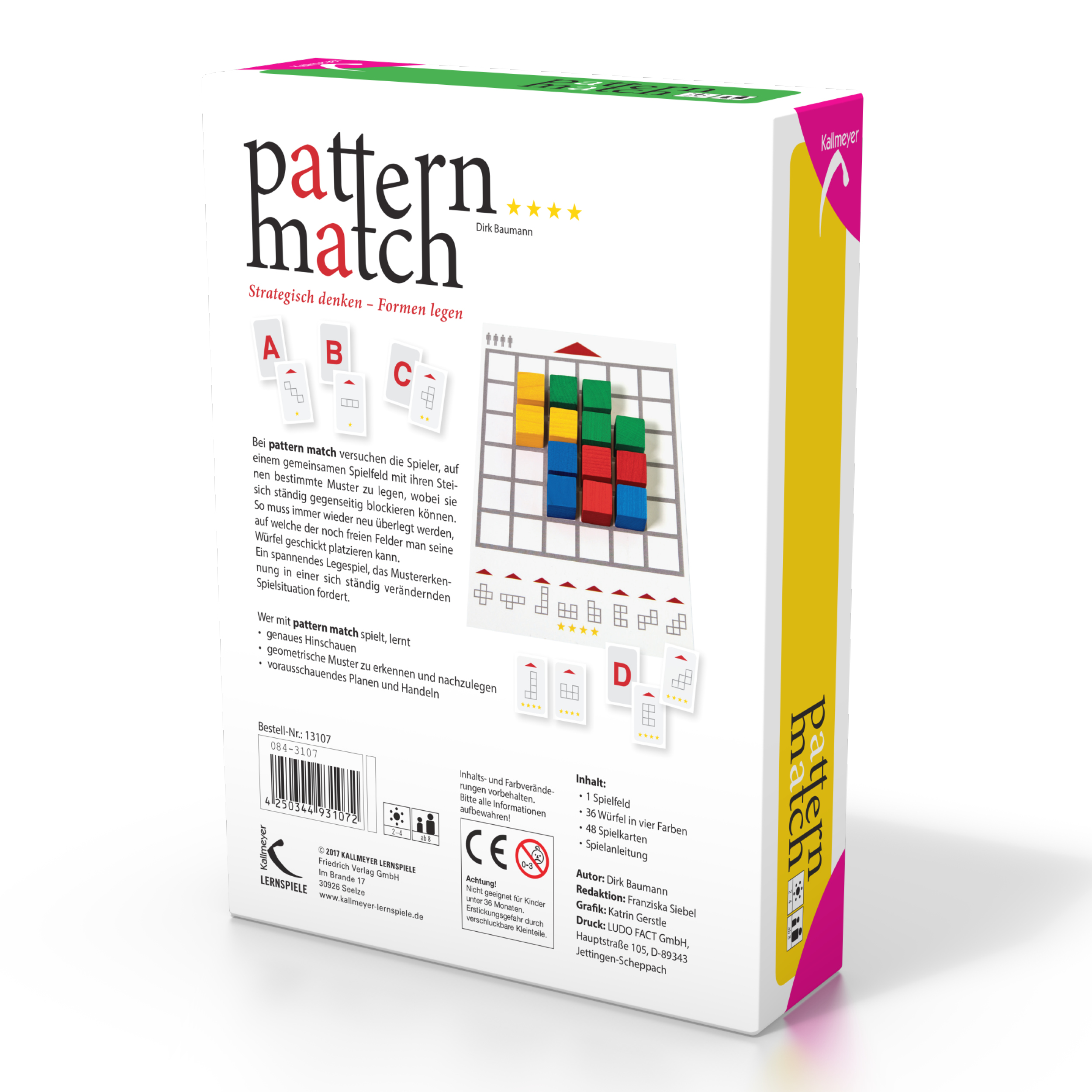 Bei Pattern Match versuchen die Spieler, auf einem gemeinsamen Spielfeld mit ihren Steinen bestimmte Muster zu legen, wobei sie sich ständig gegenseitig blockieren können. So muss immer wieder neu überlegt werden, auf welche der noch freien Felder man seine Würfel geschickt platzieren kann. Ein spannendes Legespiel, das Mustererkennung in einer sich ständig verändernden Spielsituation fordert. Wer mit Pattern Match spielt, lernt- genaues Hinschauen- geometrische Muster zu erkennen und nachzulegen- vorausschauendes Planen und Handeln.