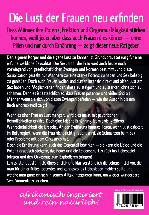 Der Autor und Coach K.T.N. Len’ssi zeigt in diesem Ratgeber erstmalig und deutlich, wie die Ernährung, die einfache Ernährung, den größten Einfluss auf die Libido der Frau hat. Er erklärt, wie das, was Frauen essen, ihre Potenz, ihre Erektion und ihr Lustempfinden schwächen, stören oder extrem steigern kann.