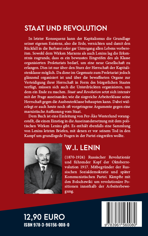 In letzter Konsequenz kann der Kapitalismus die Grundlage seiner eigenen Existenz, also die Erde, vernichten und damit den Rückfall in die Barbarei oder gar Untergang allen Lebens vorbereiten. Sowohl dem Wirken Marxens als auch Lenins lag die Erkenntnis zugrunde, dass es ein bewusstes Eingreifen des als Klasse organisierten Proletariats bedarf, um eine neue Gesellschaft zu erlangen. Dies ist nur über den Sturz der Herrschaft der Kapitalistenklasse möglich. Da diese im Gegensatz zum Proletariat jedoch glänzend organisiert ist und über die bewaffneten Organe zur Verteidigung ihrer Herrschaft in Form des bürgerlichen Staates verfügt, müssen sich auch die Unterdrückten organisieren, um dem ein Ende zu machen. Staat und Revolution setzt sich intensiv mit der Frage auseinander, wie die siegreiche Arbeiterklasse seine Herrschaft gegen die Ausbeuterklasse behaupten kann. Dabei widerlegt er auch heute noch oft vorgetragene Argumente gegen einemarxistische Auffassung vom Staat.Dem Buch ist eine Einleitung von Per-Åke Westerlund vorangestellt, die einen Einstieg in die Auseinandersetzung mit dem politischen Wirken Lenins gibt. Es enthält ebenfalls eine Sammlung von Lenins letzten Briefen, mit denen er vor seinem Tod in den Kampf um grundlegende Fragen in der Partei eingreifen wollte.