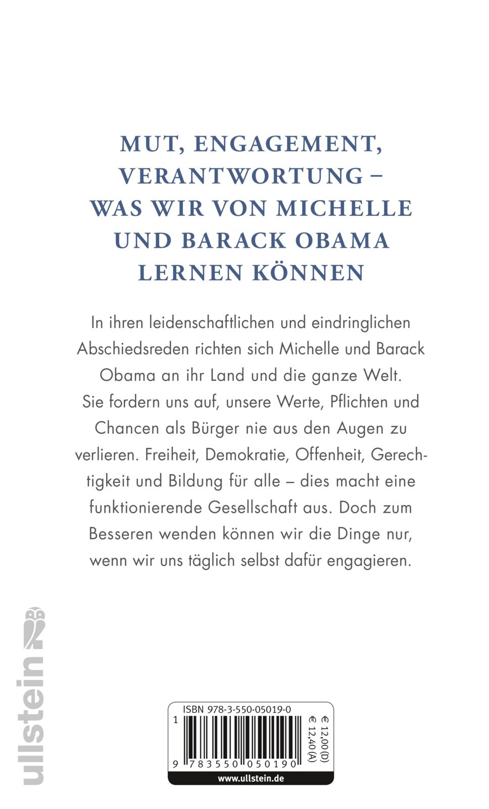 In ihren leidenschaftlichen und eindringlichen Abschiedsreden richten sich Barack und Michelle Obama an ihr Land und die ganze Welt. Sie sprechen an, worauf es ankommt im Leben und in der Politik und warum wir auch in schwierigen Zeiten Grund zur Hoffnung haben. Und Sie fordern uns auf, unsere Werte, Pflichten und Chancen als Bürger nie aus den Augen zu verlieren. Freiheit, Demokratie, Offenheit, Gerechtigkeit und Bildung für alle - dies alles macht eine funktionierende Gesellschaft aus. Doch wir müssen uns täglich dafür engagieren! Dann erst können wir einzelne Dinge und ein ganzes Land zum Besseren ändern.