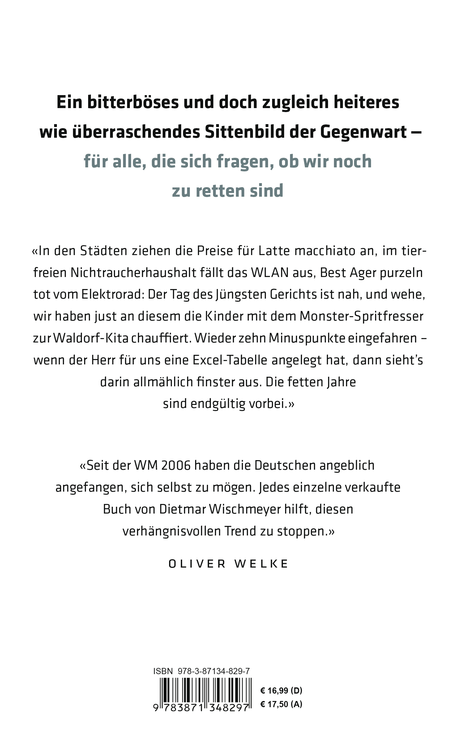 Dieses Buch gibt den verängstigten Deutschen eine Stimme: Unternehmer, Turbo-Landwirte, Pastorinnen, Rentner, Praktikanten, Politiker, Aktivistinnen - die ganz normalen Insassen dieser Republik erzählen vom Verschwinden ihrer gewohnten Lebenswelt. Dietmar Wischmeyer zeichnet ein bitterböses und doch zugleich heiteres wie überraschendes Sittenbild der Gegenwart - für alle, die sich fragen, ob wir noch zu retten sind. Eine Bestandsaufnahme all dessen, was uns heute bewegt.