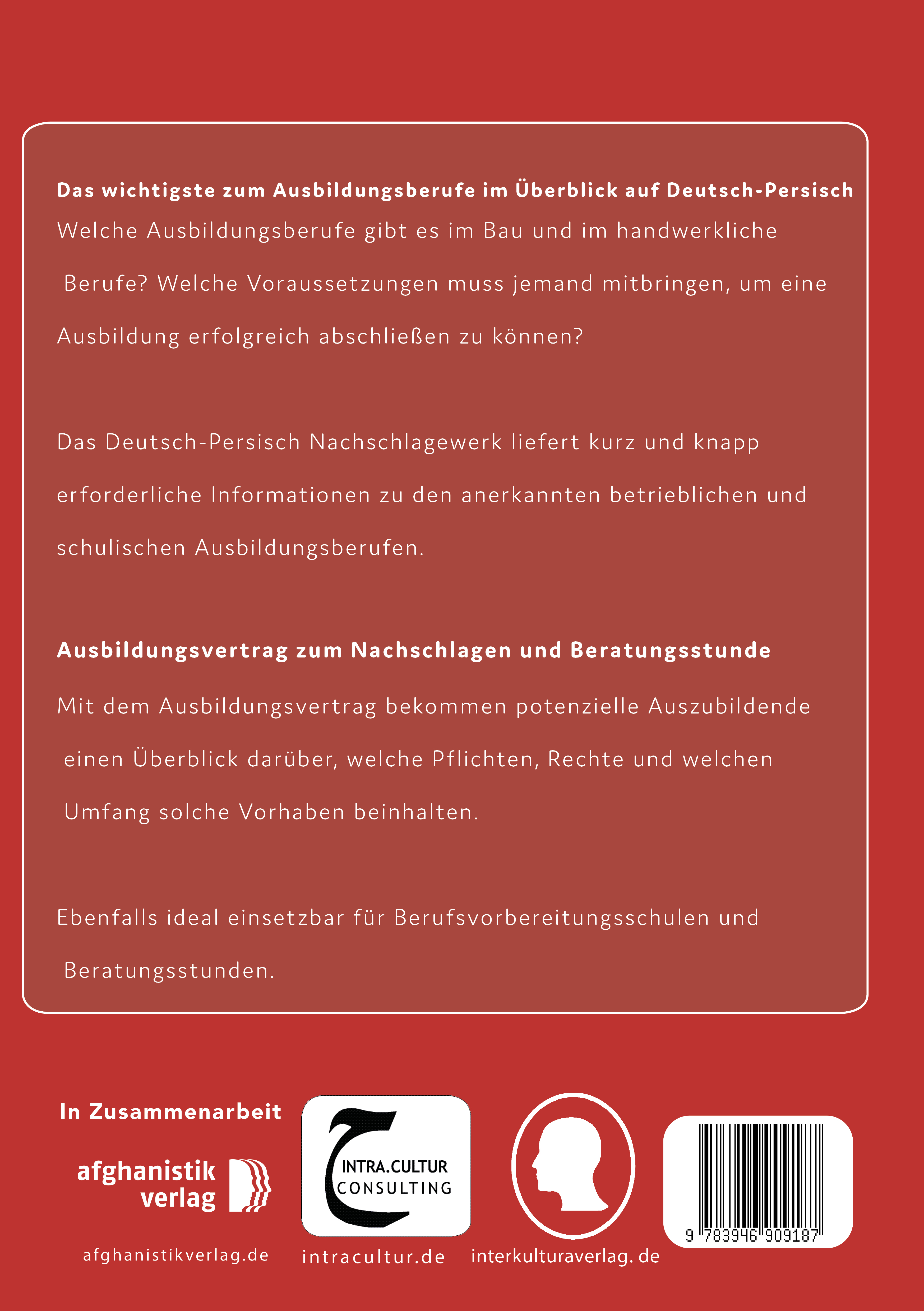 - Mit Berufsausbildungsvertrag- Mit Übersicht der 120 wichtigsten Fähigkeiten und Fertigkeiten für die Arbeitswelt- Mit 1300 Fachbegriffe aus der Ausbildung-, Berufs- und Arbeitswelt- Orientierungshilfe für minderjährige Flüchtlinge, Schutzsuchende und Berufsschüler- Wichtige Informationen über anerkannte betriebliche und schulische AusbildungsberufeDas wichtigste zum Thema Ausbildungsberufe im Überblick auf Deutsch-Persisch:Welche Ausbildungsberufe gibt es auf dem Bau und in handwerklichen Berufen? Welche Voraussetzungen muss jemand mitbringen, um eine Ausbildung erfolgreich abschließen zu können?Das Deutsch-Persische Nachschlagwerk liefert kurz und knapp erforderliche Informationen zu den anerkannten betrieblichen und schulischen Ausbildungsberufen.Fach-, Methoden- und Sozialkompetenzen auf den Punkt bringen:Um den Einstieg in die Arbeitswelt zu erleichtern, werden die notwendigen Fähigkeiten und Kompetenzen anhand von Beispielen jeweils erklärt.Wichtige Vokabeln und Fachbegriffe aus der Berufswelt:Um in der Ausbildungsphase zurechtzukommen, beinhaltet das Buch darüber hinaus zusätzlich 1000 Fachbegriffe aus der Berufswelt. Es bietet eine gelungene Kombination aus Praxisnähe und Aktualität der wichtigsten Begrifflichkeiten.Ausbildungsvertrag zum Nachschlagen und Unterstützung in der Beratungsstunde:Mit dem Ausbildungsvertrag bekommen potenzielle Auszubildende einen Überblick darüber, welche Pflichten und Rechte sie haben und was eine Ausbildung beinhaltet. Ebenfalls ideal einsetzbar für Angebote der Berufsvorbereitung und in Beratungsstunden.