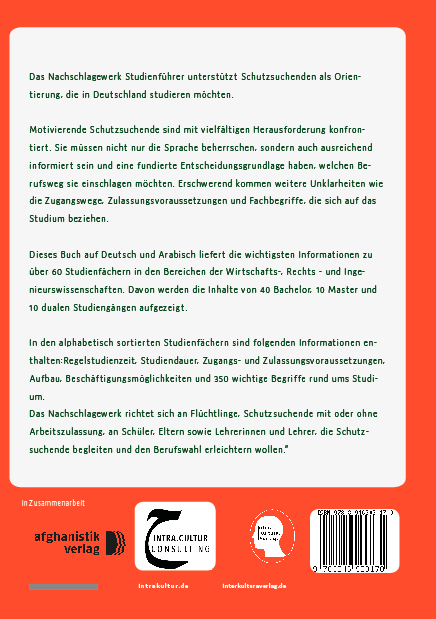 Wichtige Informationen von der Bewerbung bis zum AbschlussÜbersicht der Bachelor-, Master- und dualen Studiengängestudienrelevante Informationen rund um StudiengängeUni-Lexikon mit 350 Begriffe aus dem UniversitätsalltagWer studieren möchte, soll einen guten Zugang zum Studium haben und mit ausreichenden Informationen ausgestattet sein. Damit Flüchtlinge ein Studium aufnehmen können, benötigen sie eine Orientierung und fachliche Unterstützung.Welche Studienfächer gibt es in Deutschland? Welche Inhalte werden im Bachelor, Master und in den dualen Studiengängen gelehrt? Was ist BAföG? Was bedeutet das Wort Curriculum?Dieses Buch auf Deutsch und Arabisch liefert die wichtigsten Informationen zu über 60 Studienfächern in den Wirtschafts-, Rechts - und Ingenieurwissenschaften. Dabei werden die Inhalte von 40 Bachelor-, 10 Master- und 10 dualen Studiengängen aufgezeigt.Die alphabetisch sortierten Studienfächer bieten folgende Informationen: Regelstudienzeit, Studiendauer, Zugangs- und Zulassungsvoraussetzungen, Aufbau, Beschäftigungsmöglichkeiten und 350 wichtige Begriffe rund ums Studium.
