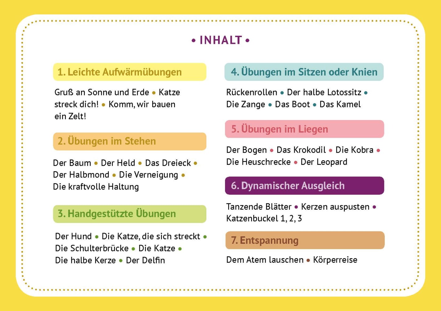 Elke Gulden, Bettina Scheer und Gabriele Pohl sind erfahrene Übungsleiterinnen für Kinderyoga. In diesem Kartenset haben sie Yoga-Übungen in sieben Kategorien zusammengestellt, die es einfach machen, eine Yogastunde für Kinder zusammenzustellen: Von Aufwärmübungen bis zur Schlussentspannung ist alles dabei, um innere Balance und Konzentration zu fördern.
