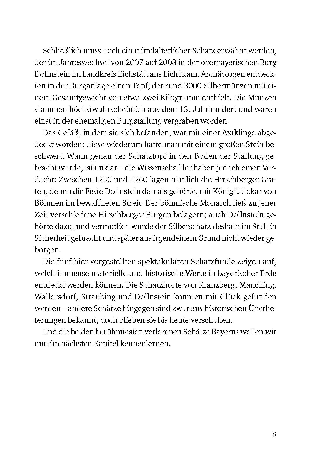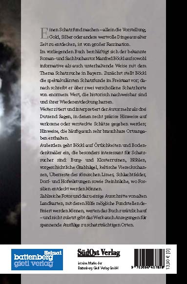 Einen Schatzfund machen - allein die Vorstellung, Gold, Silber oder andere wertvolle Dinge aus alter Zeit zu entdecken, ist von großer Faszination.Im vorliegenden Buch beschäftigt sich der bekannte Roman- und Sachbuchautor Manfred Böckl auf sowohl informative als auch unterhaltende Weise mit dem Thema Schatzsuche in Bayern. Zunächst stellt Böckl die spektakulärsten Schatzfunde im Freistaat vor; danach schreibt er über zwei verschollene Schatzhorte von enormem Wert, die historisch nachweisbar sind und ihrer Wiederentdeckung harren.Weiter zitiert und interpretiert der Autor mehr als drei Dutzend Sagen, in denen recht präzise Hinweise auf verlorene oder versteckte Schätze gegeben werden; Hinweise, die häufig auch sehr brauchbare Ortsangaben enthalten.Außerdem geht Böckl auf Örtlichkeiten und Bodendenkmäler ein, die besonders interessant für Schatzsucher sind: Burg- und Klosterruinen, Höhlen, vorgeschichtliche Grabhügel, keltische Viereckschanzen, Überreste des römischen Limes, Schlachtfelder, Dorf- und Hofwüstungen sowie Steinbrüche, wo Fossilien entdeckt werden können.Zahlreiche Fotos und dazu einige Ausschnitte von alten Landkarten, mit deren Hilfe mögliche Fundstellen definiert werden können, werten das Buch zusätzlich auf - und nicht zuletzt gibt das Werk auch Anregungen für spannende Ausflüge zu schatzträchtigen Orten.