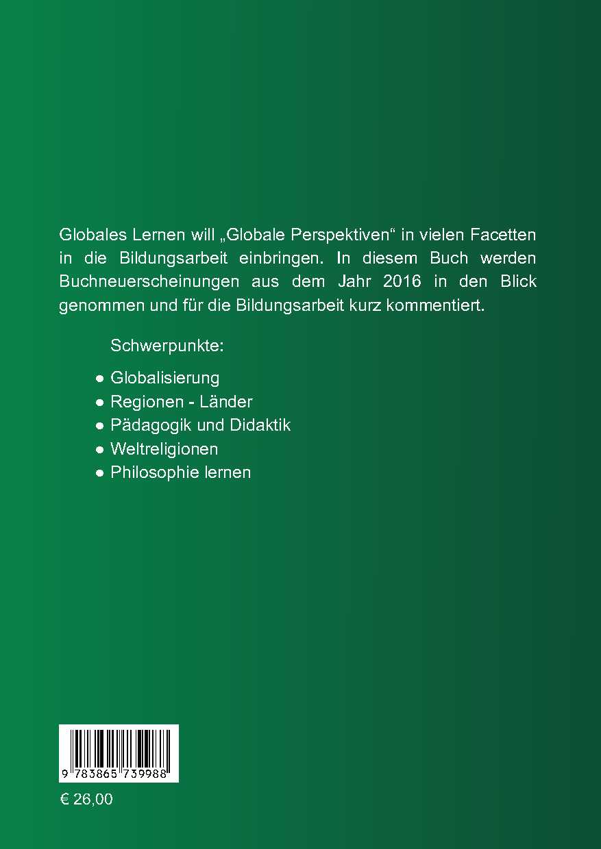Globales Lernen will „Globale Perspektiven“ in vielen Facetten in die Bildungsarbeit einbringen. In diesem Buch werden Buchneuerscheinungen aus dem Jahr 2016 in den Blick genommen und für die Bildungsarbeit kurz kommentiert.