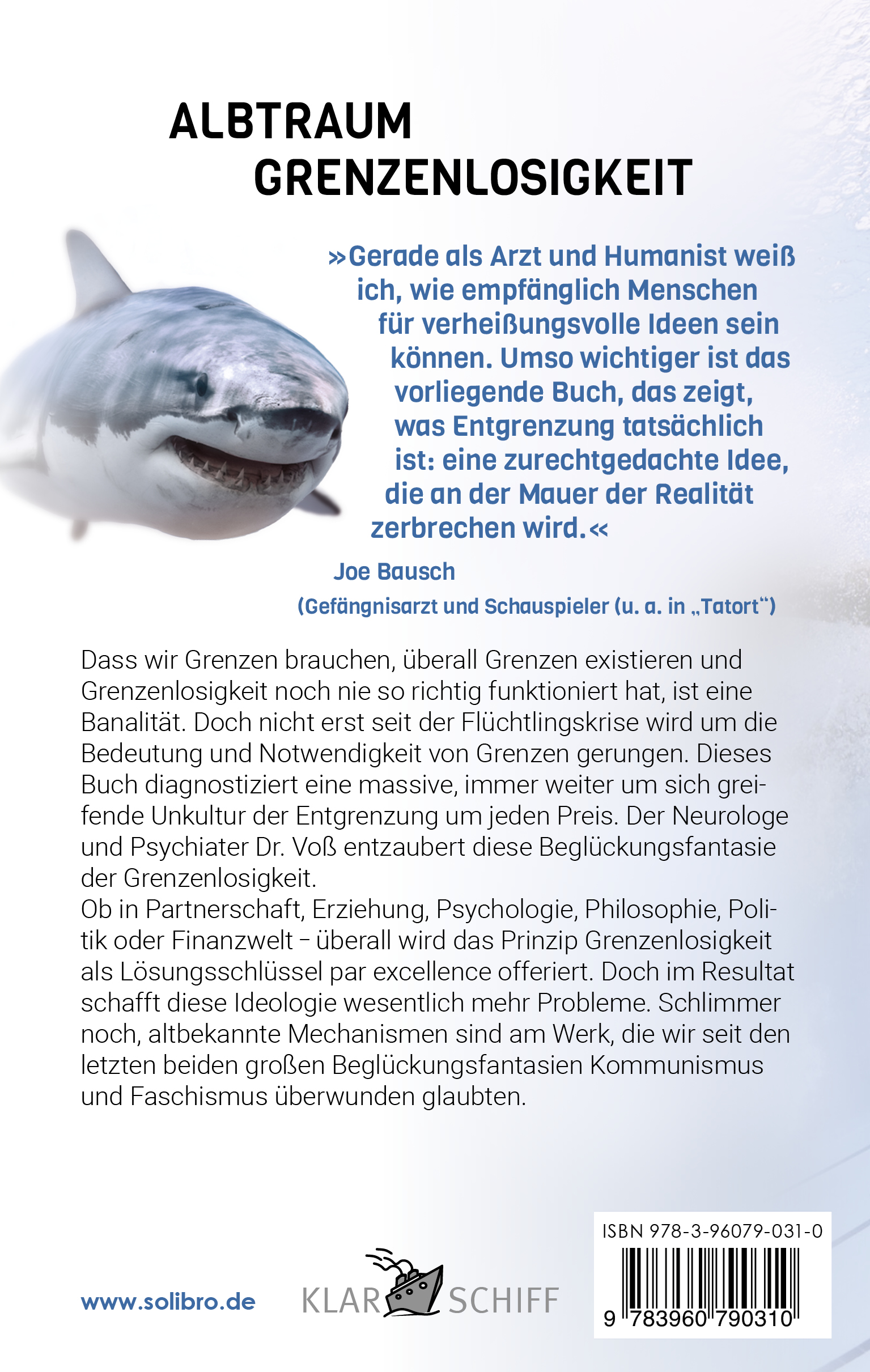 "Gerade als Arzt und Humanist weiß ich, wie empfänglich Menschen für verheißungsvolle Ideen sein können. Umso wichtiger ist das vorliegende Buch, das zeigt, was Entgrenzung tatsächlich ist: eine zurechtgedachte Idee, die an der Mauer der Realität zerbrechen wird." Joe Bausch (Gefängnisarzt und Schauspieler, u. a. in "Tatort") Dass wir Grenzen brauchen, überall Grenzen existieren und Grenzenlosigkeit noch nie so richtig funktioniert hat, ist eine Banalität. Doch nicht erst seit der Flüchtlingskrise wird um die Bedeutung und Notwendigkeit von Grenzen gerungen. Dieses Buch diagnostiziert eine massive, immer weiter um sich greifende Unkultur der Entgrenzung um jeden Preis. Der Neurologe und Psychiater Dr. Voß entzaubert diese Beglückungsfantasie der Grenzenlosigkeit. Er vergleicht die neue, alle gesellschaftlichen Bereiche erfassende Ideologie mit den großen Beglückungsfantasien Kommunismus und Faschismus, um zu zeigen: Hier sind altbekannte Mechanismen am Werk. Seine Analyse zeigt, wie aberwitzig dieses Konzept der Entgrenzung ist und dass man sich wundern muss, wie es überhaupt bei denkenden Menschen verfangen kann. Die anhaltend unkontrollierte Grenzöffnung für praktisch jedermann ist nur der Höhepunkt einer gesellschaftlichen Entwicklung, die sich in vielen anderen Bereichen manifestiert. Ob in Partnerschaft, Erziehung, Psychologie, Philosophie, Politik oder Finanzwelt - überall wird das Prinzip Grenzenlosigkeit als Lösungsschlüssel par excellence offeriert. Doch im Resultat schafft dieser Ansatz wesentlich mehr Probleme. Um für diese Gefahr die Augen zu öffnen, geht Voß bis zum Urknall zurück. Er weist nach, dass Grenzen seit jeher ein elementares, lebensbejahendes Prinzip sind, das man nicht ungestraft aufgeben kann. Denn Grenzen stellen biologisch, psychologisch, wirtschaftlich und politisch eine anthropologische Konstante dar. Gegen die selbstzerstörerischen Tendenzen dieser Ideologie setzt Voß die Forderung nach klaren Trennungen, Identifizierungen und Identitäten in einer zunehmend werterelativistischen, orientierungslosen Zeit. Bereits bei Solibro von Burkhard Voß erschienen: "Deutschland auf dem Weg in die Anstalt. Wie wir uns kaputtpsychologisieren" und "Kleines Lexikon psychologischer Irrtümer. Von Abhängigkeit bis Zwangsneurose"