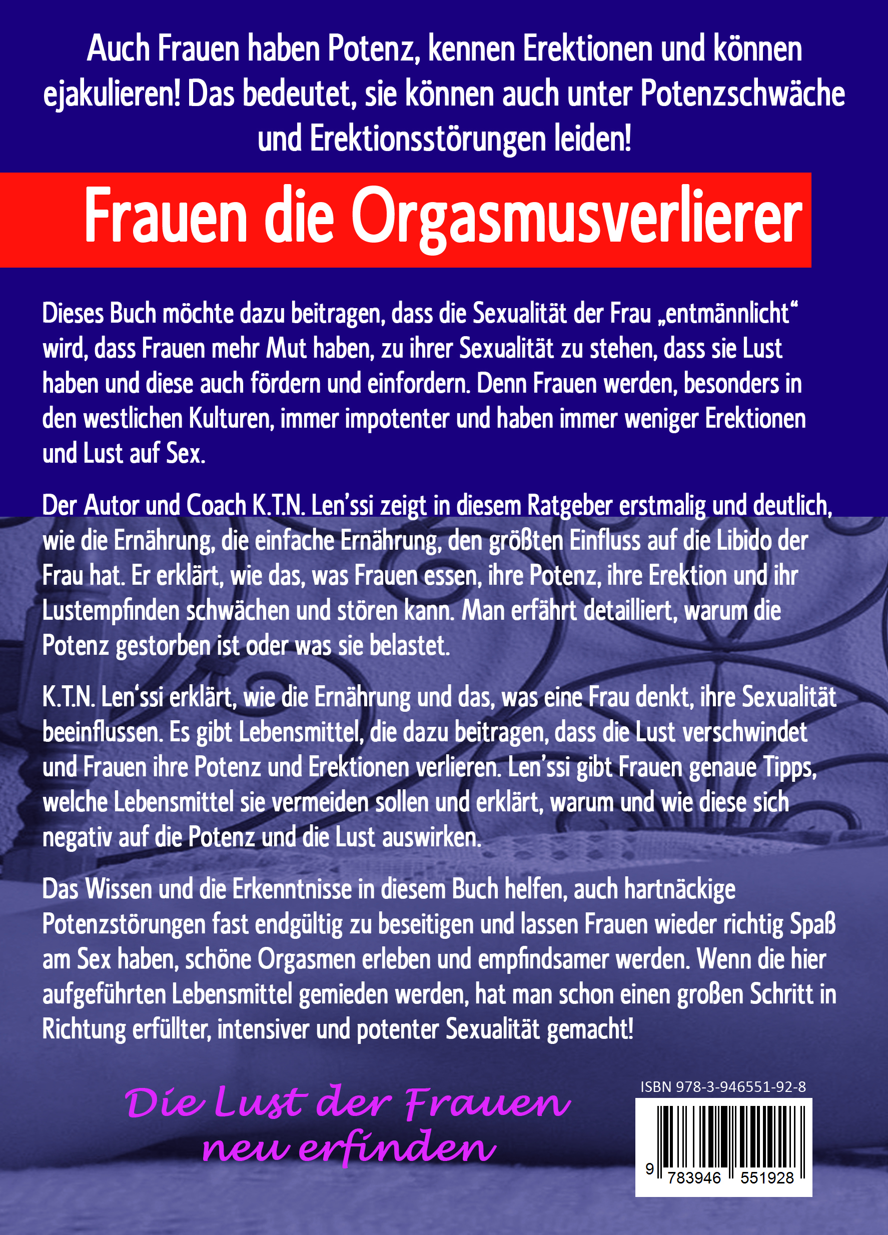 Wenn man von Impotenz und Erektionsstörungen redet, denkt man sofort nur an Männer. Dass aber Frauen sogar stärker von diesen Phänomenen betroffen sind als Männer, ahnen die meisten Menschen gar nicht. Tatsächlich aber ist die Unfähigkeit Sex zu haben, ihn zu genießen oder Lust zu empfinden ein Volksleiden unter Frauen, besonders in der westlichen Welt. Über 1/3 dieser Frauen leiden schon im frühen Alter darunter, und in Deutschland sind es sogar über 40%. Und bei Frauen über 60 liegt die Quote von Impotenz, Erektionsstörungen und Lustlosigkeit bei fast bei 90%!Der Hauptgrund, dass Frauen immer weniger Sex haben oder ihn nicht genießen oder weniger Libido haben, hat nicht nur mit psychischen Faktoren (Müdigkeit, schlechte Laune, Streit, Lieblosigkeit, Haushalt, Arbeit, Überlastung, Frust usw.), Krankheiten oder Wechseljahren zu tun - wie die meisten irrtümlich glauben. Sondern die Hauptursache ist körperlicher Natur, wie bei Männern. Meistens sind die Hormone verantwortlich, und diese Hormone werden heutzutage maßgeblich von der Ernährung beeinflusst. Das bedeutet, der eigentliche Hauptgrund für die sexuelle Unlust der Frau hat mit ihrer Ernährung zu tun. Der moderne Ernährungsstil lässt den Östrogenspiegel steigen und verursacht einen Östrogenüberschuss im Körper der Frauen, was zwangsweise zu einem Testosteronrückgang führt. Aber das Testosteron, das die Wissenschaft fälschlicherweise als "Männerhormon" definiert hat, ist das Lusthormon überhaupt - nicht das Östrogen! Das Testosteron ist zuständig für die Intensität der Libido, für die sexuelle Kraft beim Mann und bei der Frau. Wenn der Testosteronspiegel sehr niedrig ist und ständig sinkt, wenn die Testosteronproduktion gestört ist, dann kommt es bei Frauen - wie bei Männern - zu Erektionsstörungen und weniger sexuellem Antrieb.Was die Erektion der Frau und ihre Libido stören kann, ist eine schlechte Durchblutung der sexuellen Organe. Bei einem sexuellen "Angriff", schießt das Blut normalerweise in die erogenen Zonen: in den Busen, die Vagina, die Klitoris, die Schamlippen. So trägt es dazu bei, dass diese Organe erregt und empfindsam werden, die Frau genug Sekret ausschüttet und nicht trocken wird. Sind diese Regionen schlecht durchblutet, gibt es Erektionsprobleme. Auch da spielt die Ernährung eine entscheidende Rolle, denn bestimmte Lebensmittel - leider genau solche, die westliche Frauen am meisten zu sich nehmen - stören nicht nur das Blutbild, sondern tragen auch kräftig dazu bei, dass das Blut im Körper nicht richtig zirkulieren kann und die Geschlechtsorgane nicht optimal erreicht. Das führt außerdem dazu, dass Frauen schwerer einen Orgasmus bekommen, oder dass er wenig intensiv ist.In diesem Buch zeigt der Autor und Coach K.T.N. Len'ssi, wie ähnlich die weibliche und männliche Sexualität reagieren und funktionieren. Er erklärt, warum und wie die weibliche Sexualität der männlichen untergeordnet wird und vermännlicht wird. Die Potenz, die Erektionsfähigkeit der Frau, ihre Fähigkeit zu ejakulieren wird tabuisiert, weil all das nicht in das westliche Bild der sanften, weiblichen Sexualität passt. Dass Frauen eigentlich viel potenter, lustvoller, wilder im Bett sind als die Männer, weiß deshalb fast keiner mehr. Im Vergleich mit der afrikanischen weiblichen Sexualität wird dies besonders deutlich, wo Unlust, Trockenheit, Wechseljahrbeschwerden und ähnliches quasi unbekannt sind. Wir erfahren in diesem Buch genau, warum viele Frauen keine Lust auf Sex haben, weniger erregt sind, schwer einen Orgasmus erreichen. Welches sind die wirklichen Gründe, warum und welche Lebensmittel und Lebensstile führen dazu, dass sie im Bett schlapp sind, warum ihre Vagina immer trockener wird, warum sie in dieser Region immer weniger sensibel werden und kaum Lust spüren, warum die Schamlippen kaum Lust empfinden, warum die Klitoris nicht ihre ganze Lustpower gibt, warum Lustgefühle und -nerven abstumpfen, warum Frauen manchmal so lange brauchen, bis sie kommen, warum viele gar n