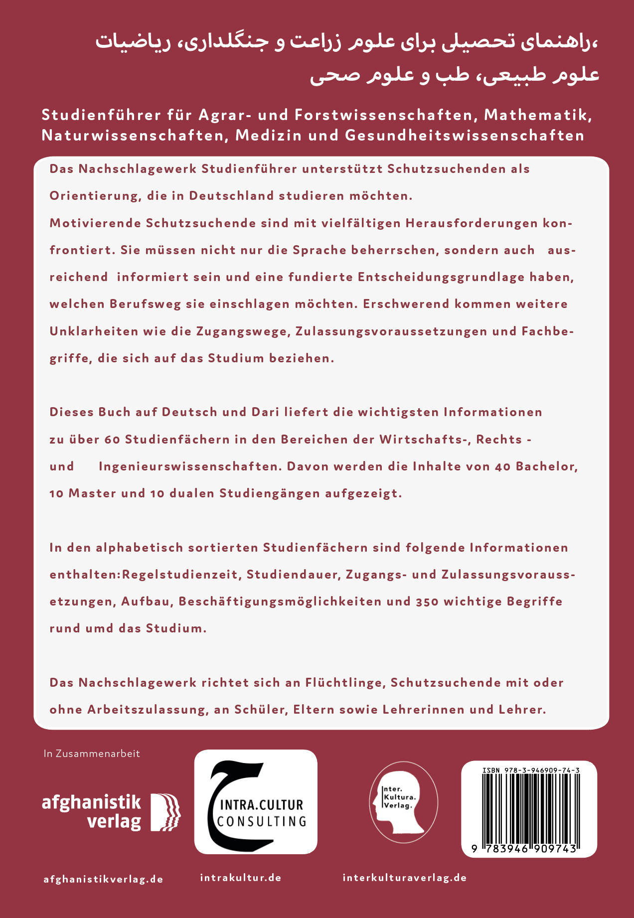 | Schlagworte | Afghanisch • Agrar • Berufsausbildung • Dari • Deutsch als Fremdsprache • Deutsch-Arabisch • Forstwissenschaften • Fremdsprache • Fremdsprachenerwerb für den Beruf • geflüchteten Menschen • Gesundheitswissenschaften • Iran • Mathematik • Medizin • Naturwissenschaften • Orientierungshilfe • Persisch • Ratgeber • Studienführer • Studium • Universität • Wörterbücher, zwei- und mehrsprachig |
