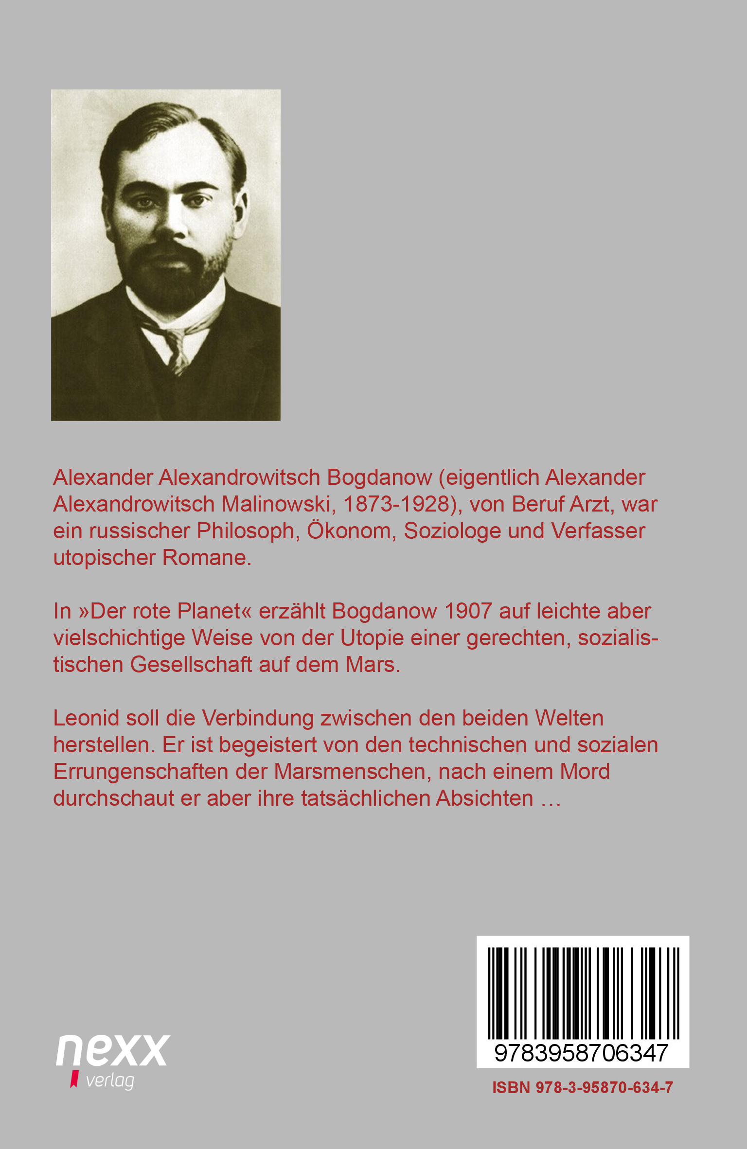 Alexander Alexandrowitsch Bogdanow (eigentlich Alexander Alexandrowitsch Malinowski, 1873-1928), von Beruf Arzt, war ein russischer Philosoph, Ökonom, Soziologe und Verfasser utopischer Romane.