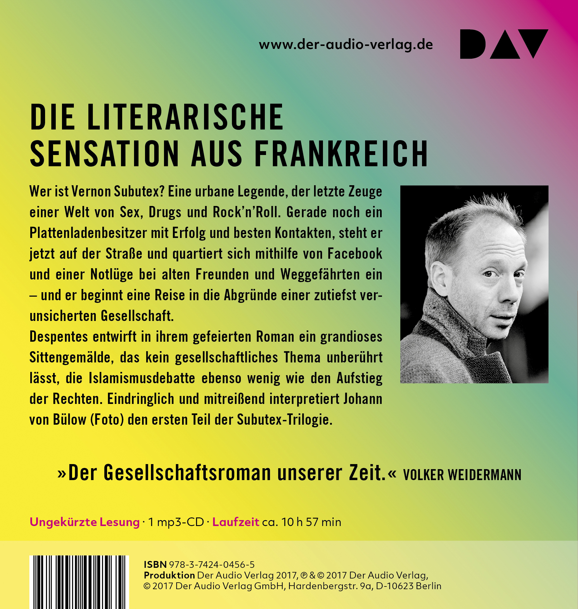 Johann von Bülow, 1972 in München geboren, debütierte 1995 an der Seite von Franka Potente in »Nach fünf im Urwald«. Darauf folgten zahlreiche Filmrollen, u.a. in »Elser« und »Kokowääh«. Von Bülow ist zudem regelmäßig im Fernsehen zu sehen, z.B. in »Herr und Frau Bulle« und »Mord mit Aussicht«. Für DAV las er u. a. die »Subutex«-Trilogie von Virginie Despentes ein.