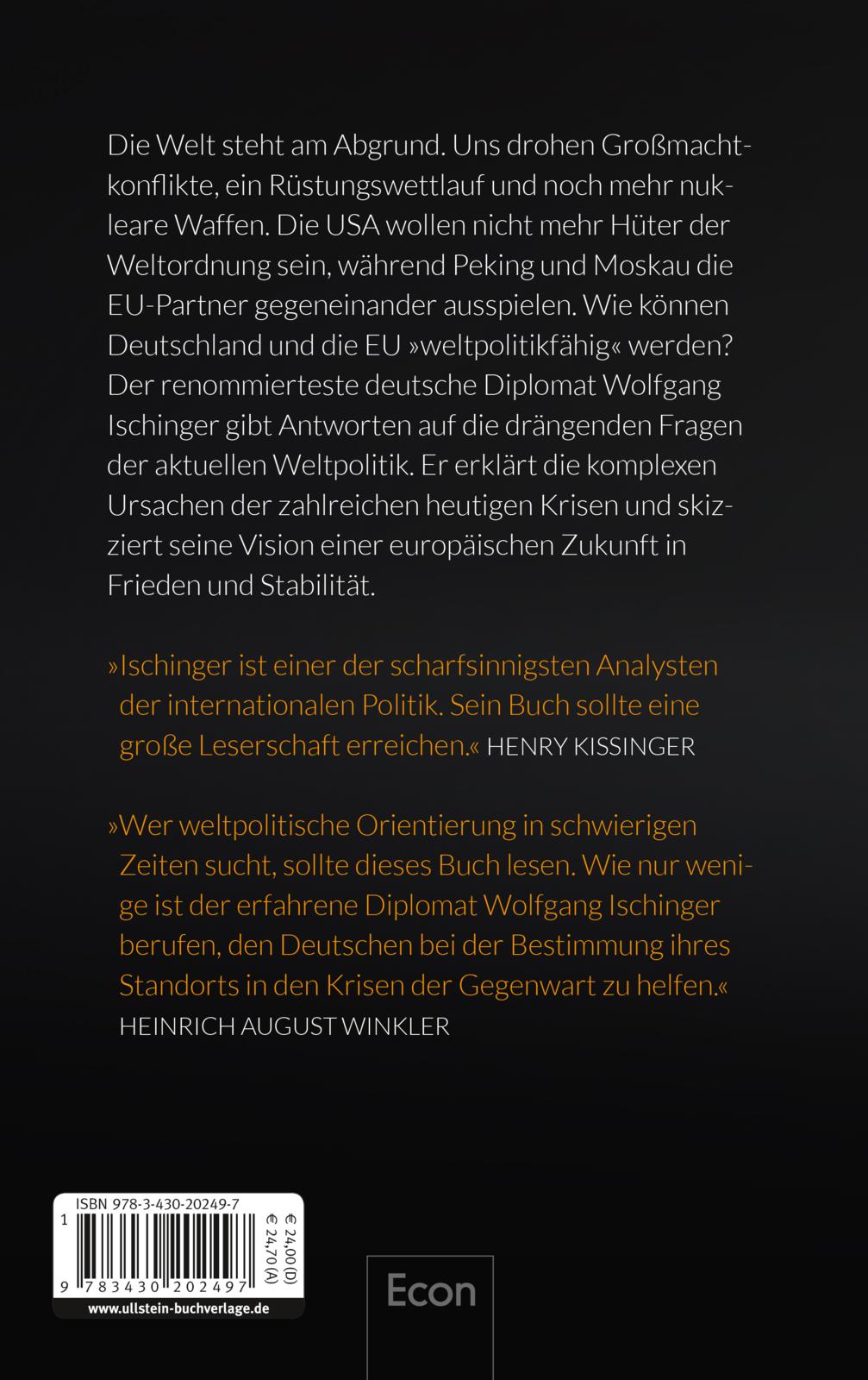 »Wer weltpolitische Orientierung in schwierigen Zeiten sucht, sollte dieses Buch lesen. Wie nur wenige ist der erfahrene Diplomat Wolfgang Ischinger berufen, den Deutschen bei der Bestimmung ihres Standorts in den Krisen der Gegenwart zu helfen.« HEINRICH AUGUST WINKLER