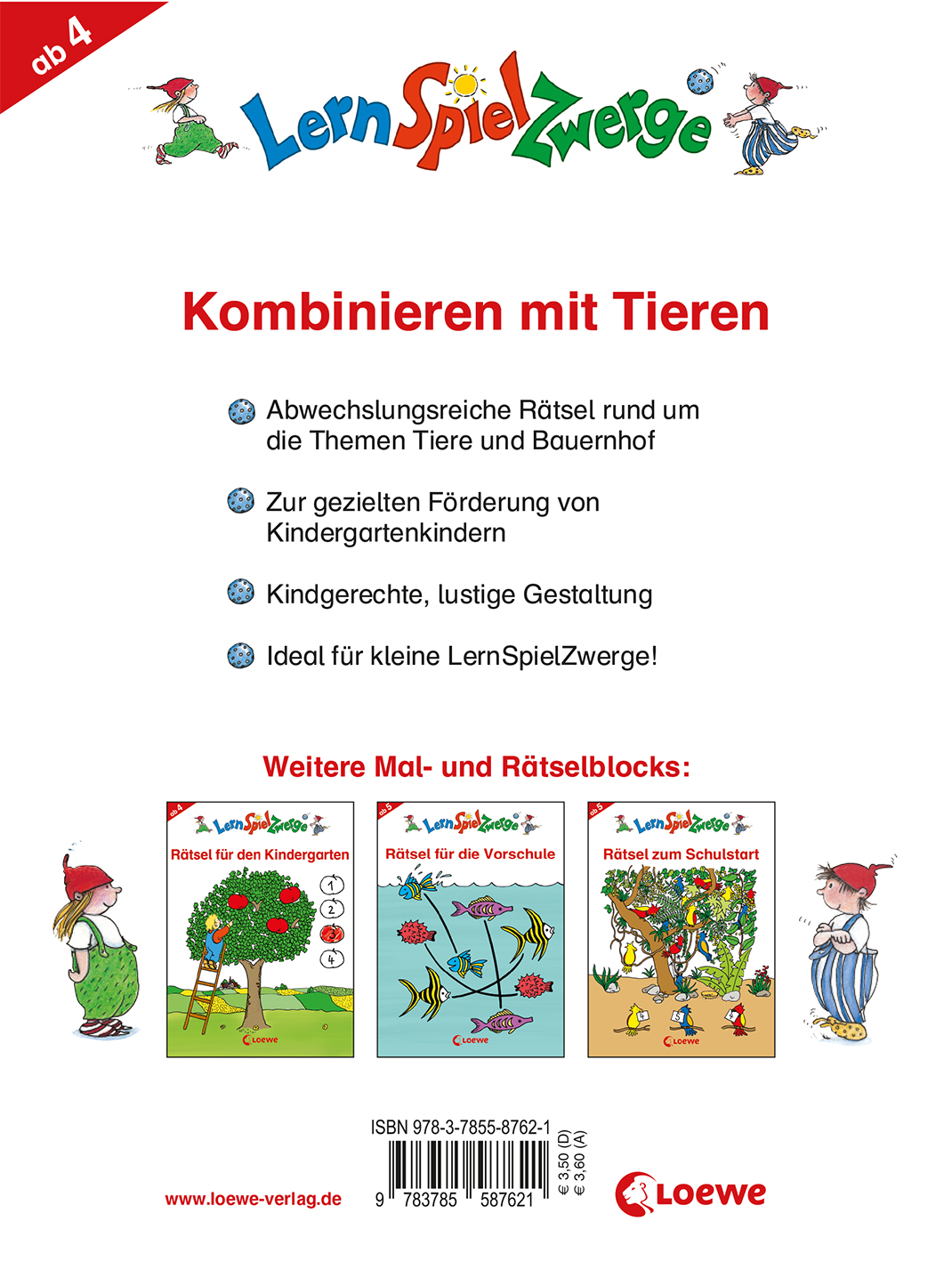 Der Block bietet Kindergartenkindern ab 4 Jahren abwechslungsreiche Rätsel und Übungen rund um die beliebten Themen Tiere und Bauernhof. Punkte- und Kombinationsrätsel, Labyrinthe, Zählübungen und viele weitere Aufgaben bringen den kleinen LernSpielZwergen viel Spaß und schulen gleichzeitig wichtige Fertigkeiten wie erste Mathe Kenntnisse, Konzentration, Kombinationsfähigkeit und Motorik.