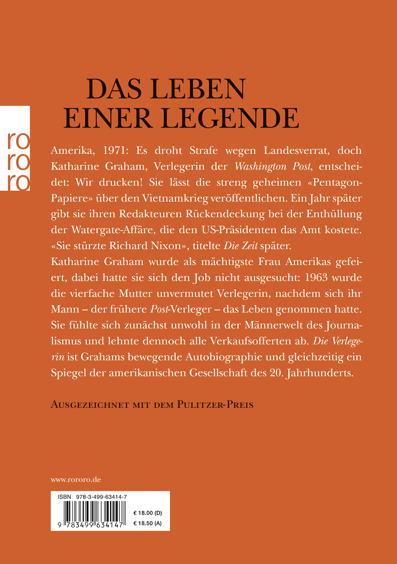 "Die Verlegerin" ist Katharine Grahams bewegende Autobiographie und gleichzeitig ein Spiegel der amerikanischen Gesellschaft des 20. Jahrhunderts. Mit 46 Jahren wurde Graham unvermutet Verlegerin der Washington Post, nachdem sich ihr Mann - der frühere "Post"-Verleger - das Leben genommen hatte. Sie fühlte sich zunächst unwohl in der Männerwelt des Journalismus und lehnte dennoch alle Verkaufsofferten ab. Ihre mutigen Entscheidungen prägen die Zeitung bis heute. 1971 lässt die streng geheimen "Pentagon-Papiere" über den Vietnam-Krieg veröffentlichen, trotz drohender Strafe wegen Landesverrat. Ein Jahr später gibt sie ihren Redakteuren Rückendeckung bei der Enthüllung der Watergate-Affäre, die den US-Präsidenten das Amt kostete. Graham wurde als mächtigste Frau Amerikas gefeiert. "Sie stürzte Richard Nixon", titelte "Die Zeit" später.