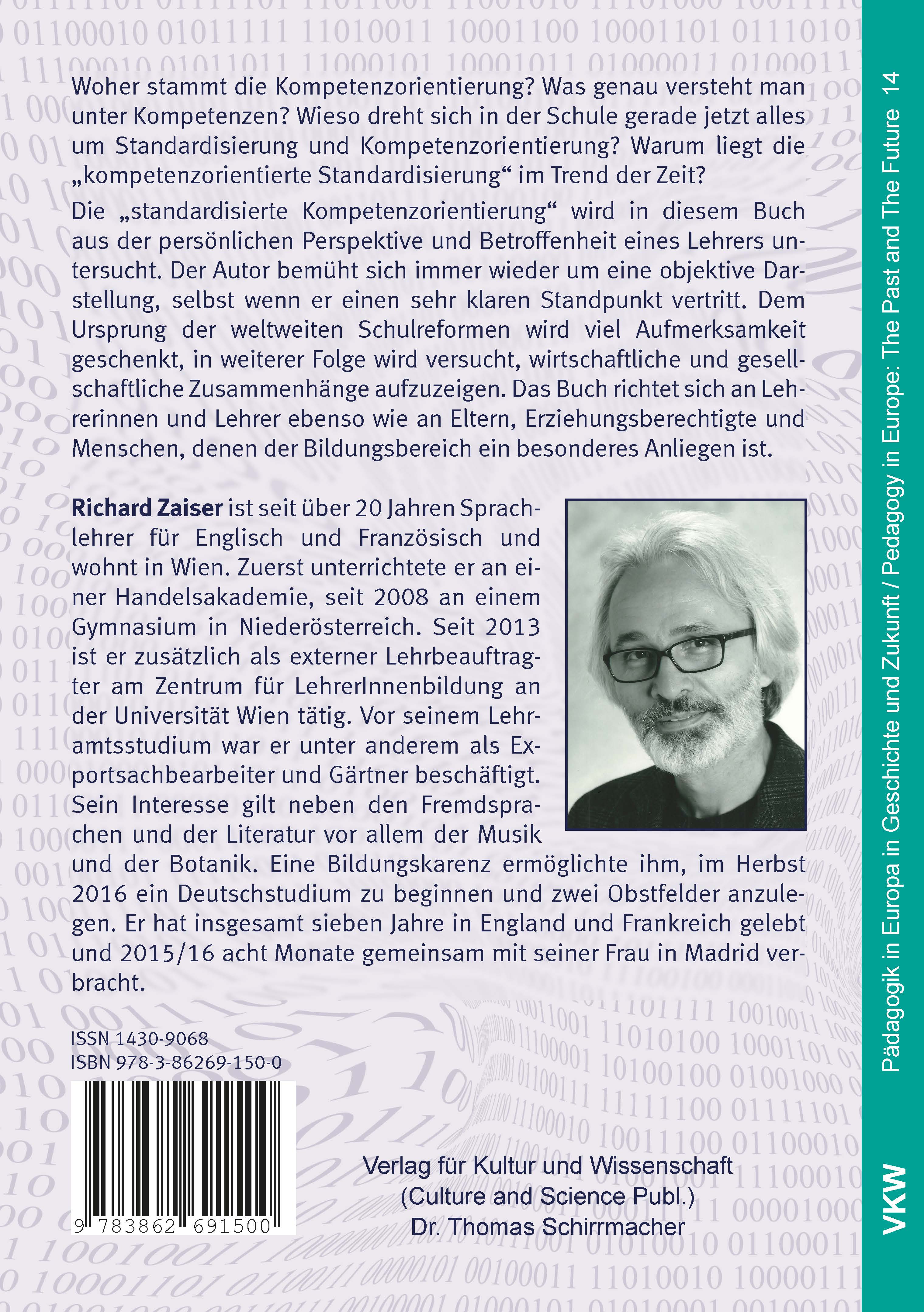 Woher stammt die Kompetenzorientierung? Was genau versteht man unter Kompetenzen? Wieso dreht sich in der Schule gerade jetzt alles um Standardisierung und Kompetenzorientierung? Warum liegt die „kompetenzorientierte Standardisierung“ im Trend der Zeit? Die „standardisierte Kompetenzorientierung“ wird in diesem Buch aus der persönlichen Perspektive und Betroffenheit eines Lehrers untersucht. Der Autor bemüht sich immer wieder um eine objektive Darstellung, selbst wenn er einen sehr klaren Standpunkt vertritt. Dem Ursprung der weltweiten Schulreformen wird viel Aufmerksamkeit geschenkt, in weiterer Folge wird versucht, wirtschaftliche und gesellschaftliche Zusammenhänge aufzuzeigen. Das Buch richtet sich an Lehrerinnen und Lehrer ebenso wie an Eltern, Erziehungsberechtigte und Menschen, denen der Bildungsbereich ein besonderes Anliegen ist. Richard Zaiser ist seit über 20 Jahren Sprachlehrer für Englisch und Französisch und wohnt in Wien. Zuerst unterrichtete er an einer Handelsakademie, seit 2008 an einem Gymnasium in Niederösterreich. Seit 2013 ist er zusätzlich als externer Lehrbeauftragter am Zentrum für LehrerInnenbildung an der Universität Wien tätig. Vor seinem Lehramtsstudium war er unter anderem als Exportsachbearbeiter und Gärtner beschäftigt. Sein Interesse gilt neben den Fremdsprachen und der Literatur vor allem der Musik und der Botanik. Eine Bildungskarenz ermöglichte ihm, im Herbst 2016 ein Deutschstudium zu beginnen und zwei Obstfelder anzulegen. Er hat insgesamt sieben Jahre in England und Frankreich gelebt und 2015/16 acht Monate gemeinsam mit seiner Frau in Madrid verbracht.