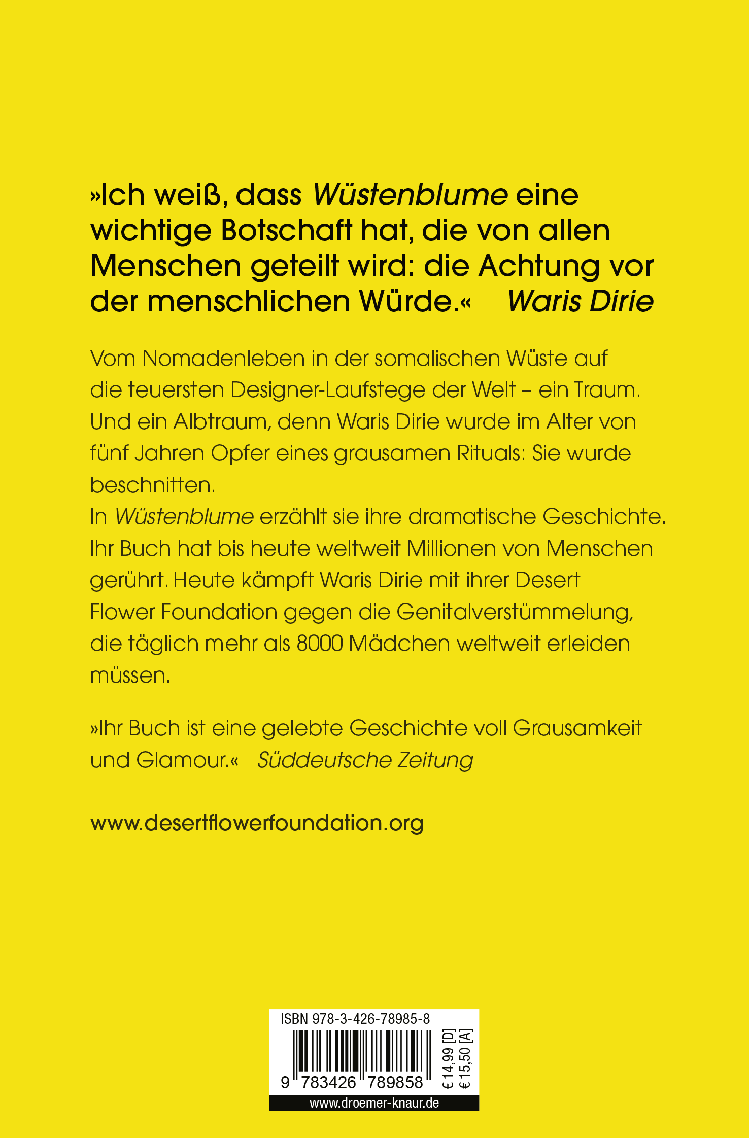 In "Wüstenblume" erzählt sie ihre Geschichte. Heute kämpft Waris Dirie mit ihrer Desert Flower Foundation gegen die Genitalverstümmelung, der heute noch täglich 600 Mädchen zum Opfer fallen sowie für die Rechte der afrikanischen Frauen.