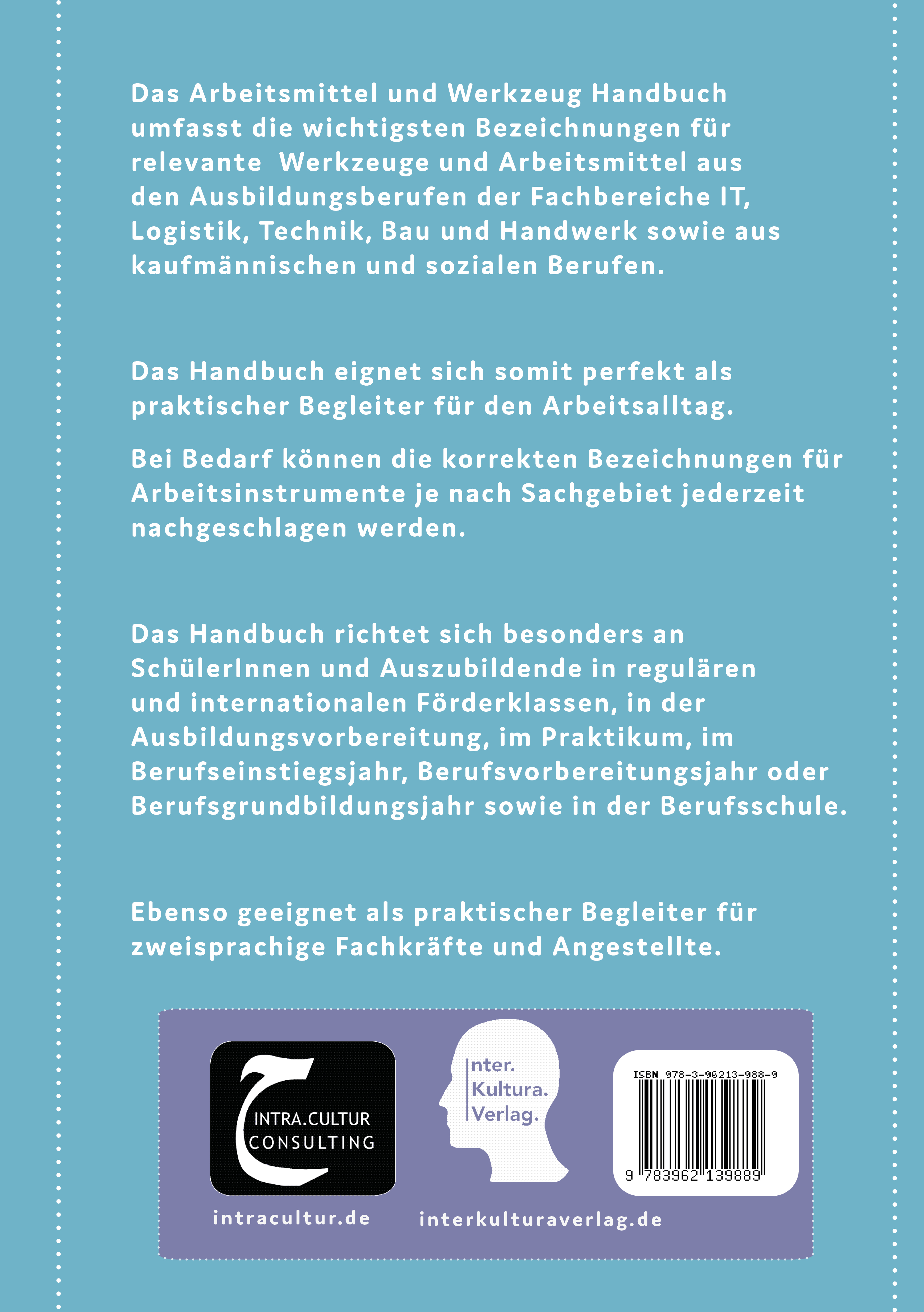 Das Arbeitsmittel und Werkzeug Handbuch umfasst die wichtigsten Bezeichnungen für relevante Werkzeuge und Arbeitsmittel aus den Ausbildungsberufen der Fachbereiche IT, Logistik, Technik, Bau und Handwerk sowie aus kaufmännischen, medizinischen und sozialen Berufen.Das Handbuch passt durch sein handliches Format in jede Tasche und eignet sich somit perfekt als praktischer Begleiter für den Arbeitsalltag. Bei Bedarf können die korrekten Bezeichnungen für Arbeitsinstrumente je nach Sachgebiet jederzeit nachgeschlagen werden.Das Nachschlagewerk ist auf der Basis von Befragungen und Begleitungen von Praktikanten, Auszubildenden und Angestellten mit Sprachkenntnissen auf der A1 Niveaustufe entstanden und ist daher stark bedarfs- und praxisorientiert.Das Handbuch richtet sich besonders an SchülerInnen und Auszubildende in regulären und internationalen Förderklassen, in der Ausbildungsvorbereitung, im Praktikum, im Berufseinstiegsjahr, Berufsvorbereitungsjahr oder Berufsgrundbildungsjahr sowie in der Berufsschule. Ebenso geeignet als praktischer Begleiter für zweisprachige Fachkräfte und Angestellte.