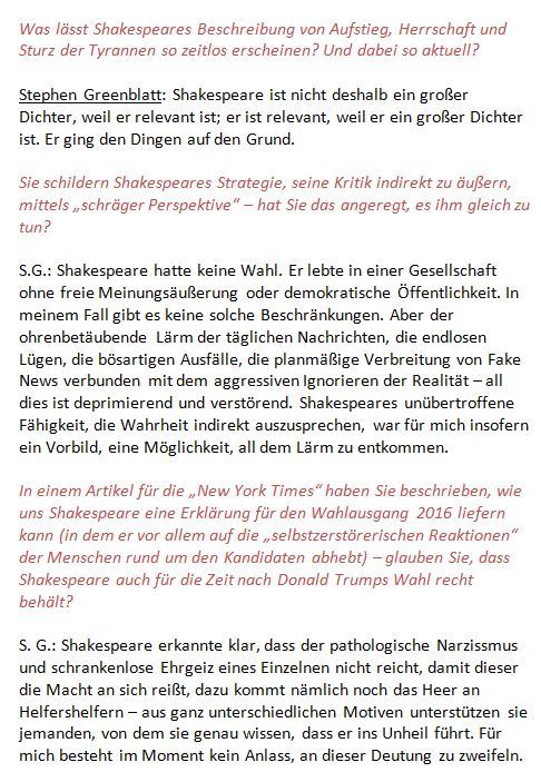 "Shakespeares Worte reichen weit über ihre Entstehungszeit hinaus. Sie sprechen uns direkt an. In bedrohlichen, verwirrenden Zeiten können wir uns auch heute noch an Shakespeare wenden und fundamentale menschliche Wahrheiten bei ihm finden. Wie diese: Glaubt nicht, so etwas kann nicht passieren. Schweigt nicht. Nutzt eure Wählerstimme." Stephen Greenblatt