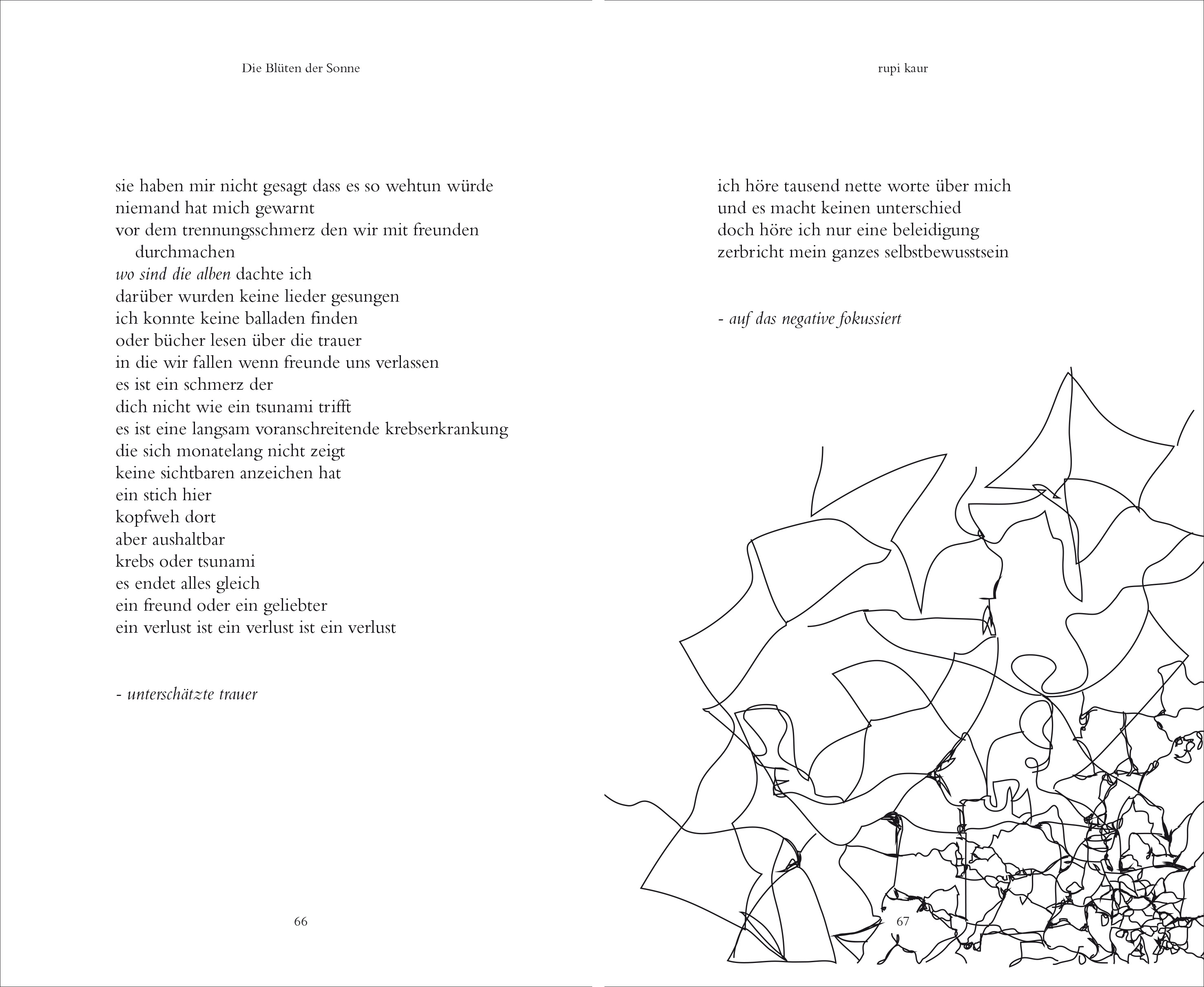 Leicht kommen ihre Zeilen daher, federzart wie ihre Zeichnungen in dem wunderschön gestalteten zweiten Gedichtband ›die blüten der sonne‹ […].