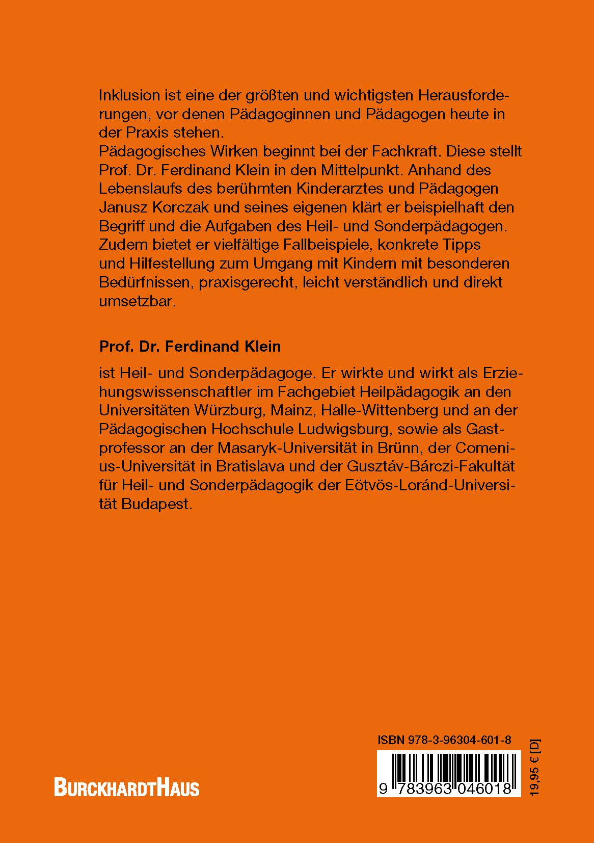 Inklusion ist eine der größten und wichtigsten Herausforderungen, vor denen Pädagogen und Pädagoginnen heute in der Praxis stehen.Pädagogisches Wirken beginnt bei der pädagogischen Fachkraft und so beginnt auch Prof. Dr. Ferdinand Klein bei seinem eigenen Werdegang als Heilpädagoge und beim Kinderarzt und Pädagogen Janusz Korczak, um sich dem Begriff und der Aufgabe des Heil- und Sonderpädagogen zu nähern.Zudem bietet das Buch vielfältige Fallbeispiele, konkrete Tipps und Hilfestellungen zum Umgang mit Kindern mit besonderen Bedürfnissen, praxisgerecht, leicht verständlich und direkt umsetzbar.