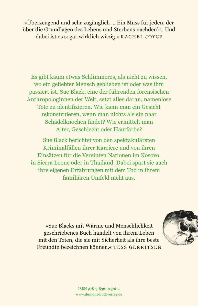 »Egal ob Sue Black die sieben Stadien der Verwesung schildert oder verschiedene Arten der Zerstückelung erläutert. Sie triftet dabei nie ab ins Voyeuristische und bewahrt stets die Würde der Toten – in ihrem Buch und in ihrer Arbeit.«