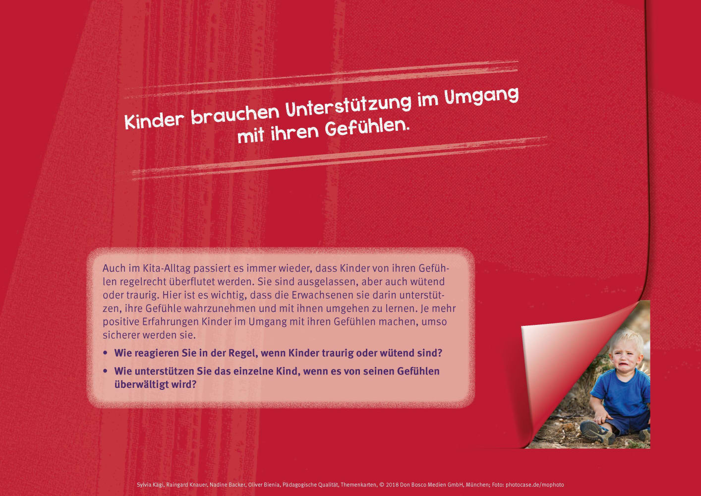 Was macht eigentlich eine gute Kita aus? Die Autor*innen zeigen in diesem Themenkartenset für Teamarbeit, Supervision und Fortbildung, dass Qualität aus dem Zusammenspiel von organisatorischen Rahmenbedingungen, fachlichen Kompetenzen, der Haltung der pädagogischen Fachkräfte und ihrer Interaktion mit den Kindern resultiert. Das Set enthält 30 kraftvolle Bildimpulse, anregende Leitfragen und Statements zu den Themen: wertschätzende Fachkraft-Kind-Interaktion, Lebensweltorientierung und Partizipation als Grundlage didaktischen Handelns, lebensweltorientierte didaktische Planung und ihre Umsetzung in pädagogisches Handeln sowie die Kita als lernende Organisation.