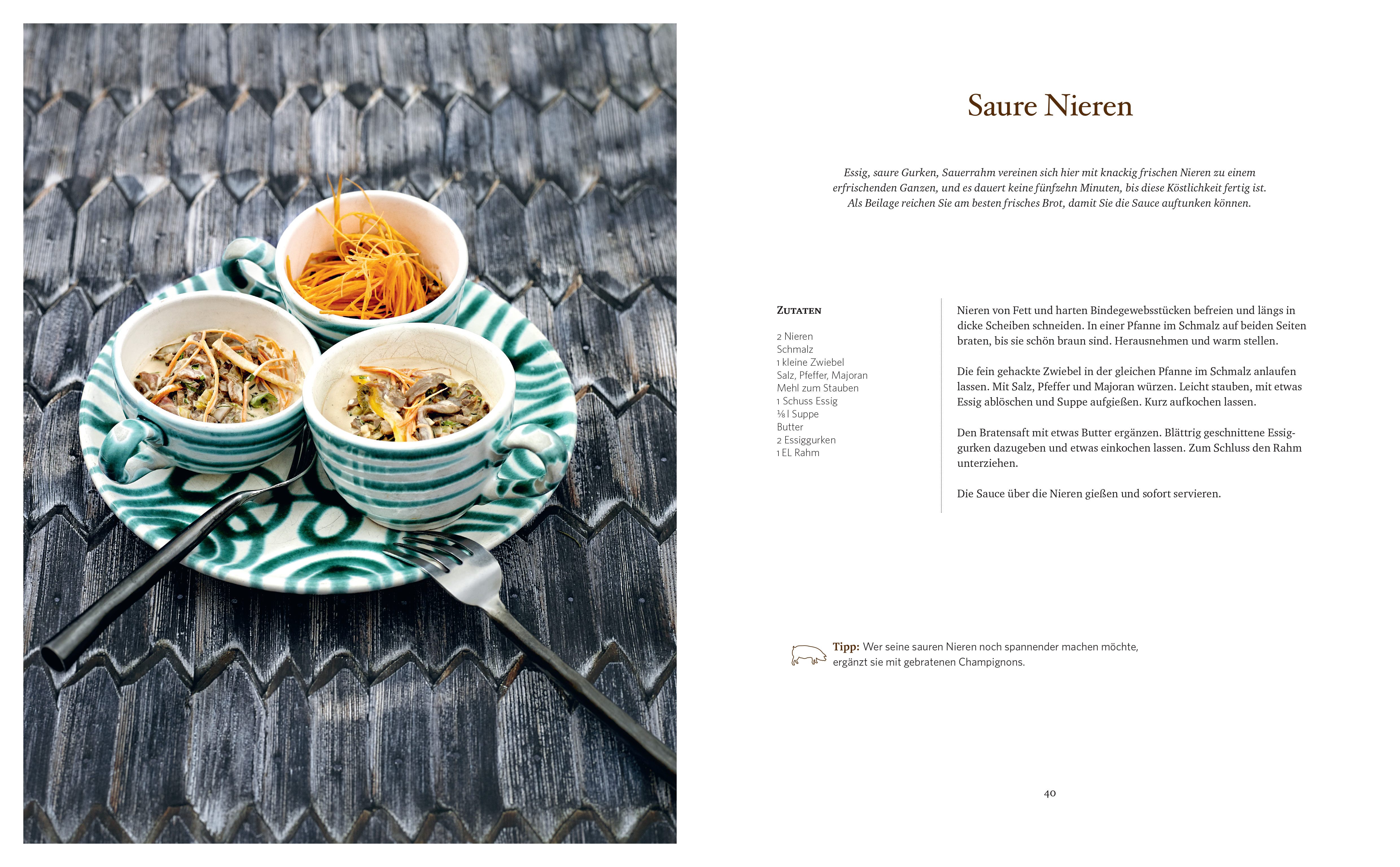 Max Stiegl hat dafür klassische Rezepte verfeinert und neue Kreationen geschaffen, außerdem zeigt er Rezepte für Mutige, die noch nicht alles probiert haben. So finden sich Gerichte von gesottenem Rüssel in Bier über Blunz-Suppe bis Schweinsfuß-Medaillons. Hobbyköchen wird erklärt, worauf man beim Kauf von Fleisch und Innereien achten muss, wenn gerade kein Sautanz in der Nähe stattfindet, und wie vielfältig einsetzbar Schwein in der Küche ist.