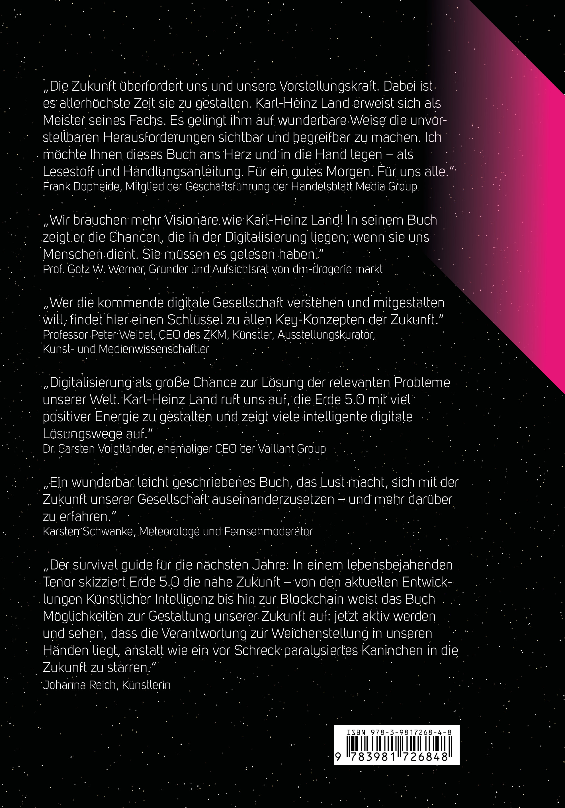 Hunger und Armut, Klimawandel und Energieverschwendung, Ungleichheit und Ungerechtigkeit, Ressourcenraubbau und Misswirtschaft: In seinem neuen Buch "Erde 5.0 - Die Zukunft provozieren" zeigt Karl-Heinz Land auf, wie sich die drängenden Probleme der Welt mithilfe digitaler Technologien lösen lassen. Für Land ist jetzt die Chance, die exponentielle Leistungszunahme der IT und den unterschätzten Megatrend der Dematerialisierung für eine zukunftssichere und gerechtere Welt zu nutzen.