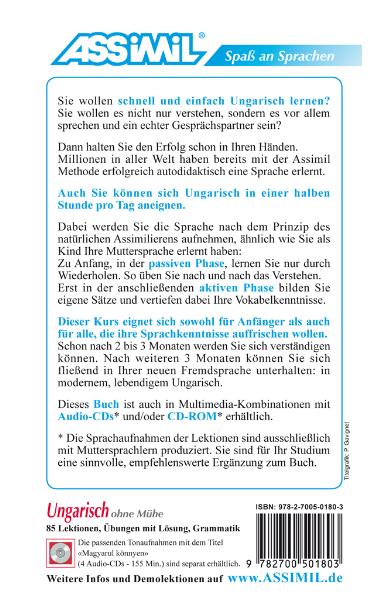 Ungarisch ohne Mühe - Lehrbuch - Niveau A1 bis B2Dieser progressiv aufgebaute Assimil-Selbstlernkurs bietet Ihnen einen leichten Einstieg in die ungarische Sprache und ermöglicht Ihnen, in 85 Lektionen umfassend die Grundlagen des Ungarischen und einen Wortschatz von ca. 2.000 Vokabeln zu erlernen, und das ganz ohne Auswendiglernen und Grammatikpauken.Der Sprachkurs richtet sich an Einsteiger, die die ungarische Sprache gerade erst für sich entdeckt haben sowie an Fortgeschrittene, die ihre Kenntnisse auffrischen und vertiefen möchten.Kurze Lektionen in übersichtlicher Gestaltung fördern Ihren Lernerfolg:- Fremdsprachige Dialoge mit sinngemäßer und größtenteils auch wörtlicher deutscher Übersetzung werden durch kurze, präzise Anmerkungen zu Grammatik, Vokabular und bestimmte sprachliche Phänomene ergänzt.- Verständnis- und Lückentextübungen helfen Ihnen, Ihren Lernfortschritt zu überprüfen.- In regelmäßigen Wiederholungslektionen wird der Stoff vertieft und anhand von Beispielen systematisch verdeutlicht, so dass Sie das Gelernte aufarbeiten und festigen können.Am Ende erreichen Sie das sprachliche Niveau der Stufe B2 des Gemeinsamen Europäischen Referenzrahmens für Sprachen; dies entspricht ungefähr 6 Semestern VHS. Die in den Lektionen vermittelten Strukturen und der erlernte Wortschatz machen Sie fit für die mühelose Kommunikation mit Ungarischsprechenden in allen Alltagssituationen. In weniger als einem Jahr werden Sie sich auf Ungarisch unterhalten können.Sprachen: Deutsch, Ungarisch