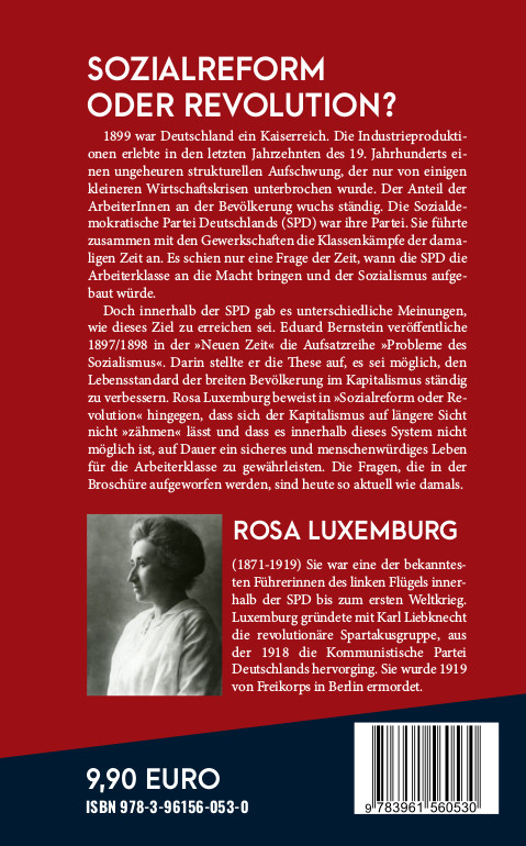 Doch innerhalb der SPD gab es unterschiedliche Meinungen, wie dieses Ziel zu erreichen sei. Eduard Bernstein veröffentliche 1897/1898 in der "Neuen Zeit" die Aufsatzreihe "Probleme des Sozialismus". Darin stellte er die These auf, es sei möglich, den Lebensstandard der breiten Bevölkerung im Kapitalismus ständig zu verbessern. Rosa Luxemburg beweist in "Sozialreform oder Revolution" hingegen, dass sich der Kapitalismus auf längere Sicht nicht "zähmen" lässt und dass es innerhalb dieses System nicht möglich ist, auf Dauer ein sicheres und menschenwürdiges Leben für die Arbeiterklasse zu gewährleisten. Die Fragen, die in der Broschüre aufgeworfen werden, sind heute so aktuell wie damals.